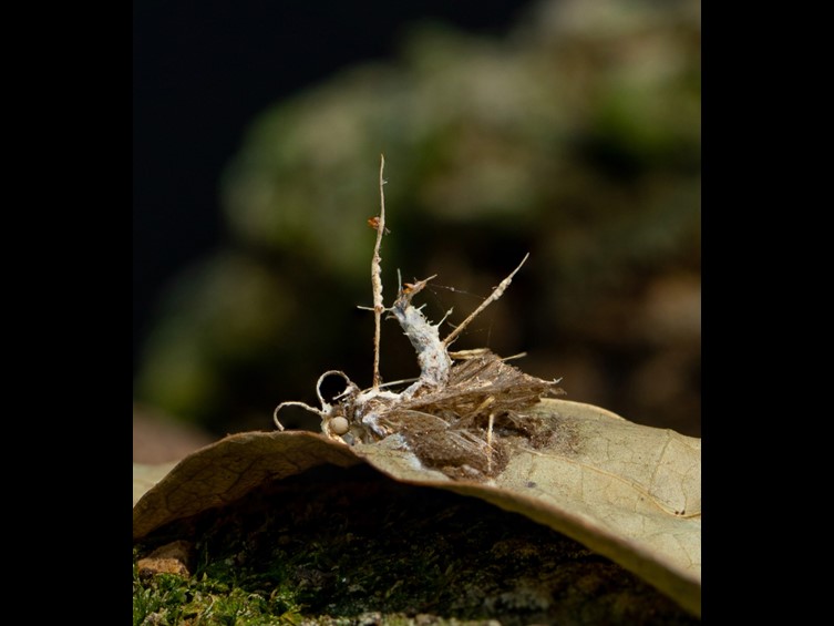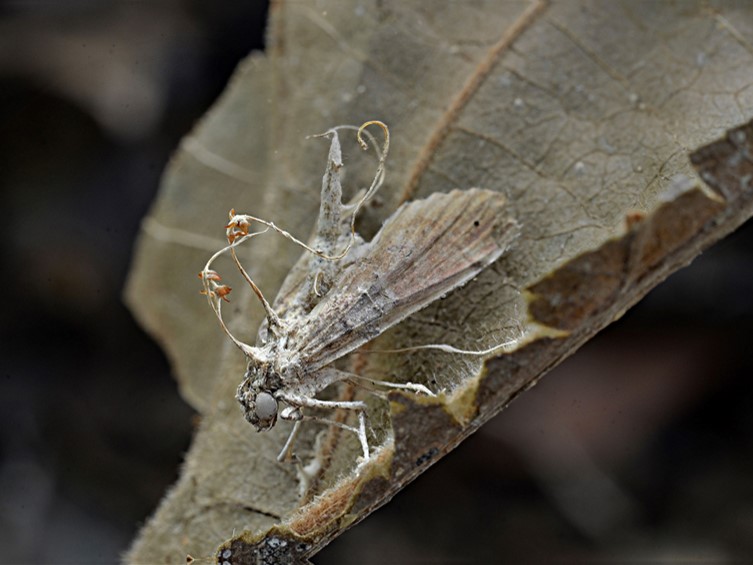 Specimens found on adult moths (Lepidoptera), on the underside of dicotyledonous leaves, thin whitish mycelium covering the host body.