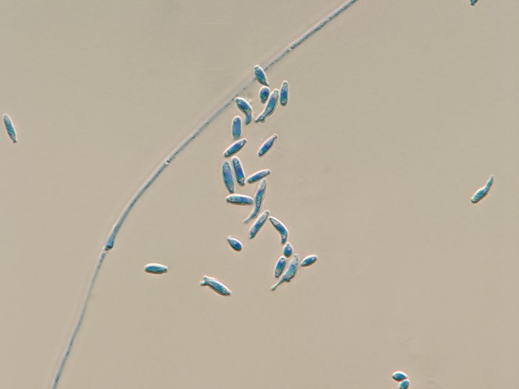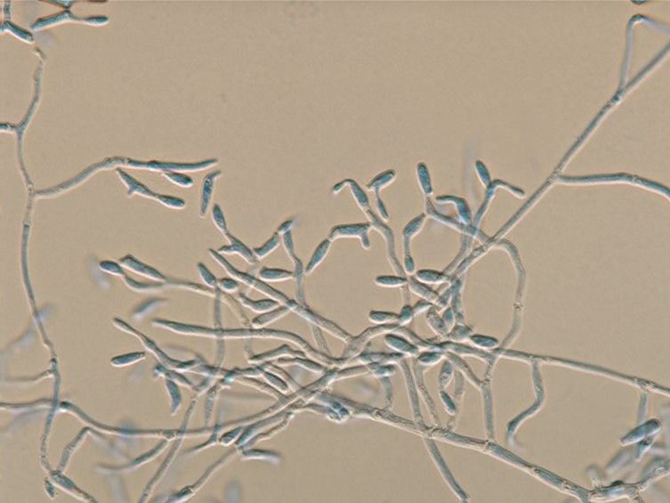 Conidia on PDA 1-celled, obovoid, smooth-walled, hyaline,