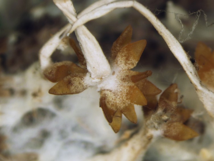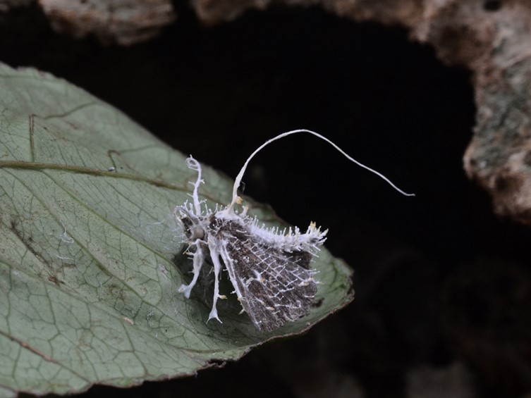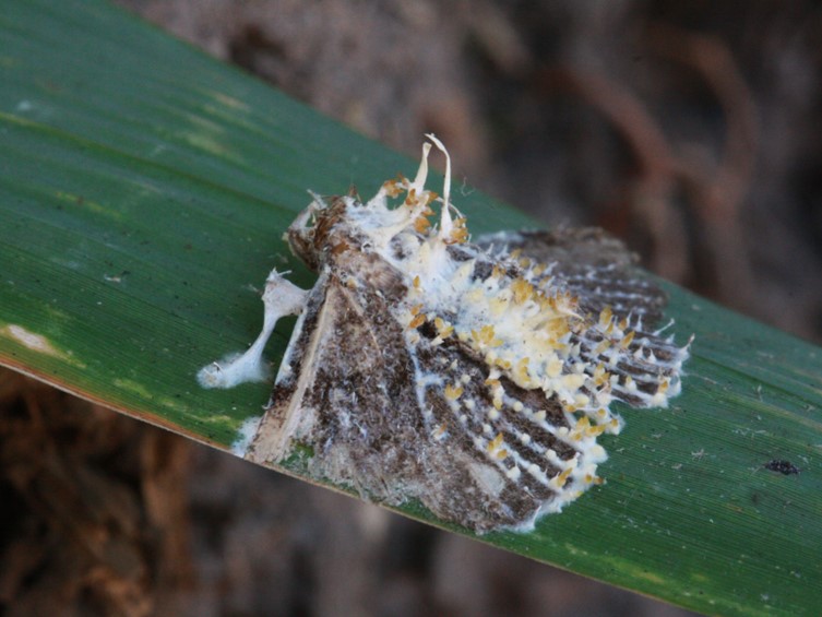 Adult moth attached to the midrib of monocotyledonous leaf or undersides of dicotyledonous leaf covered by white to cream mycelium.