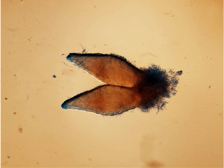 Perithecia superficial, orange to light brown, few to numerous, crowded at the tip of the stroma or growing directly from mycelium in host body and wing veins, ovoid, 530-1000 × 290-425 μm.