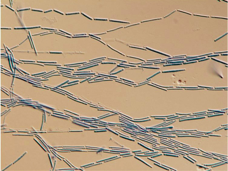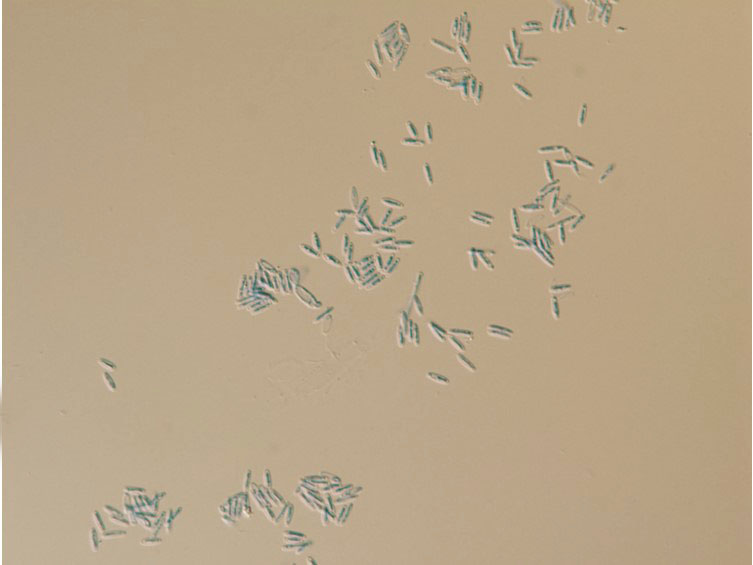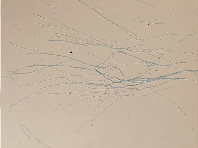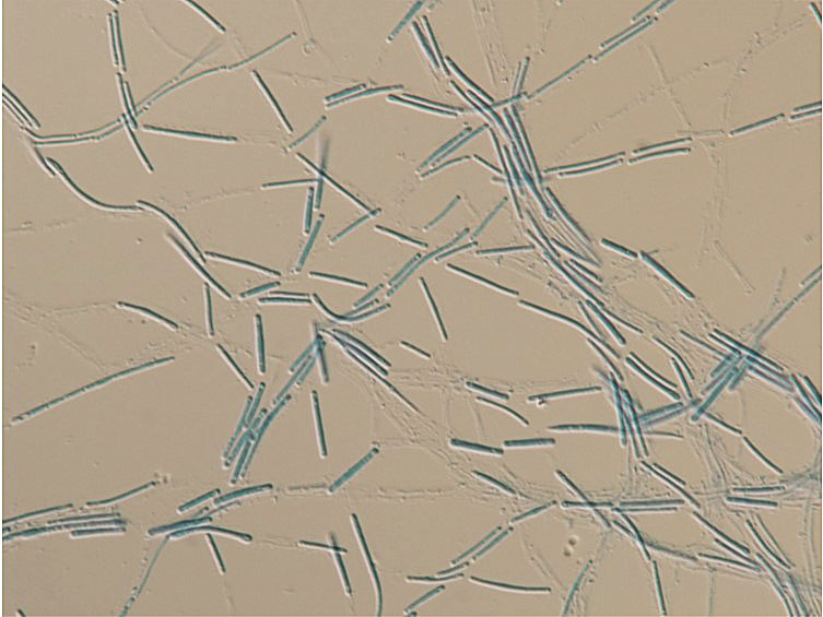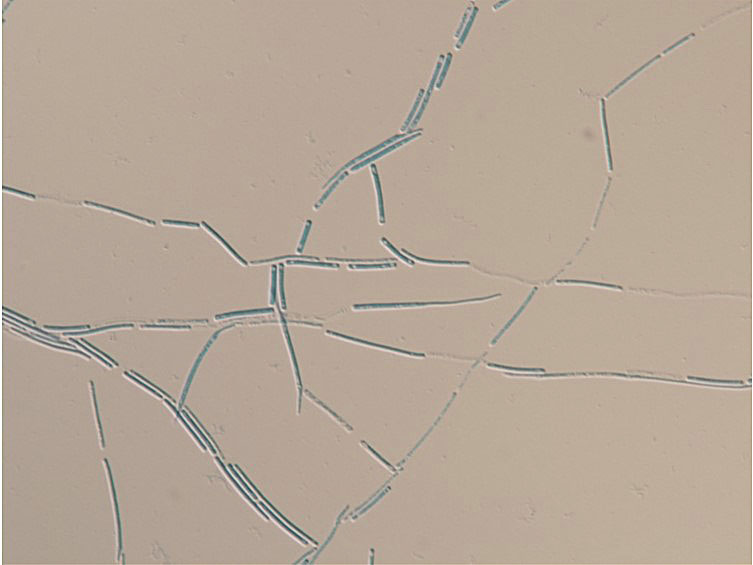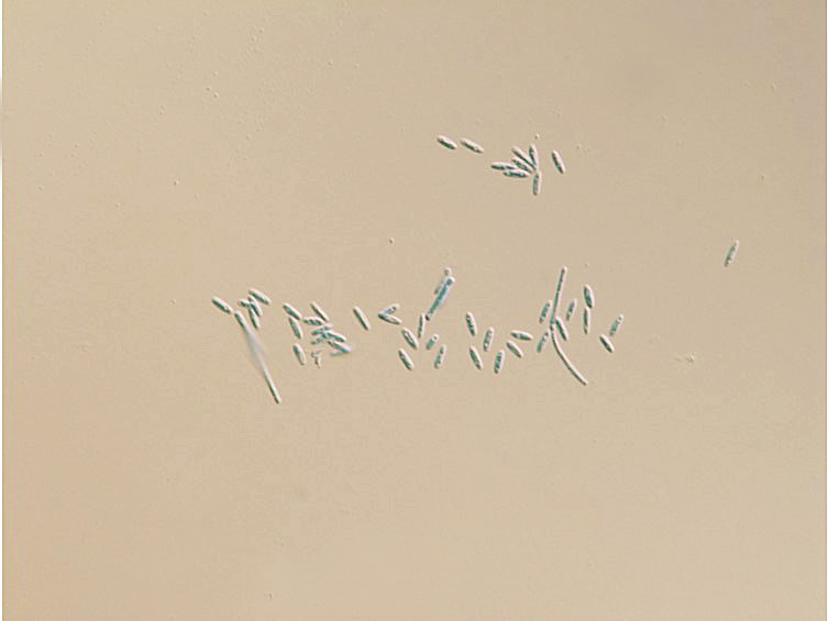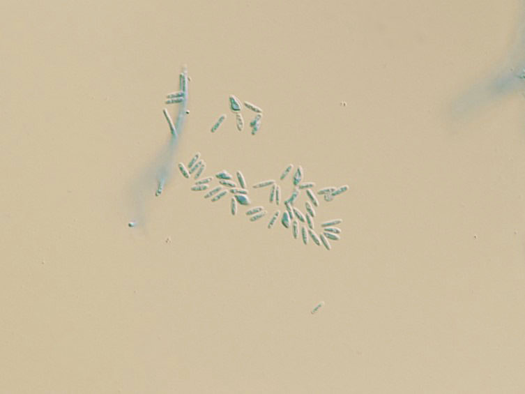 Conidia cylindrical with round end, hyaline, 3-6 × 1 μm.