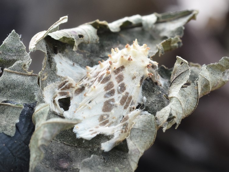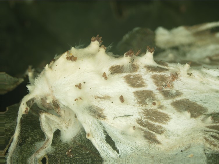 Specimens found on adult of Lemyra sp. (Erebidae: Lepidoptera), on the upper side of dicotyledonous leaves and the leaf litter, thin whitish mycelium covering the host body.
