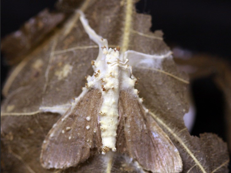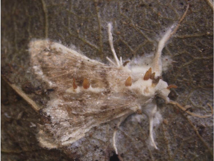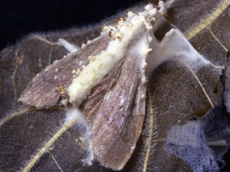Adult moth attached on the undersides of dicotyledonous leaf covered by white to cream mycelium.