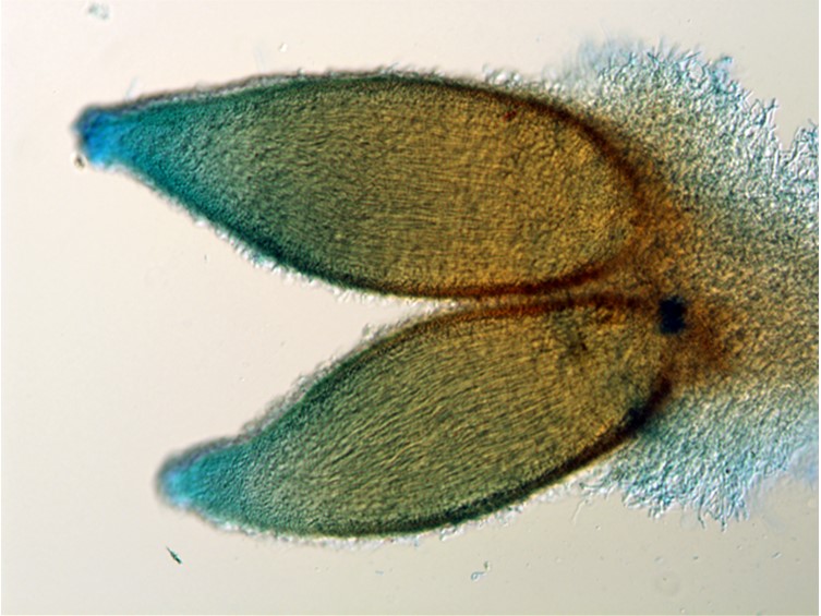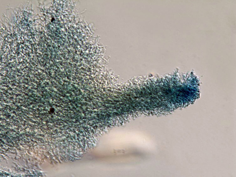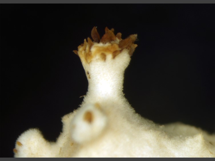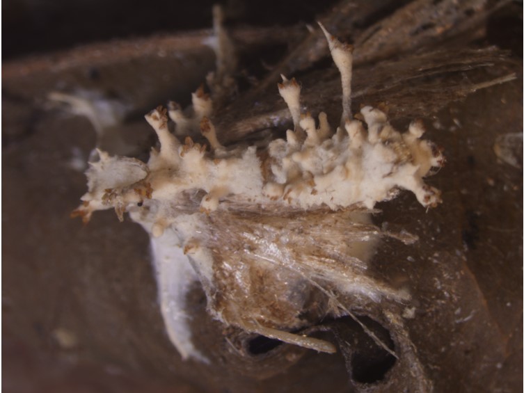 Stroma arising from host body and wings, white to cream, cylindrical.