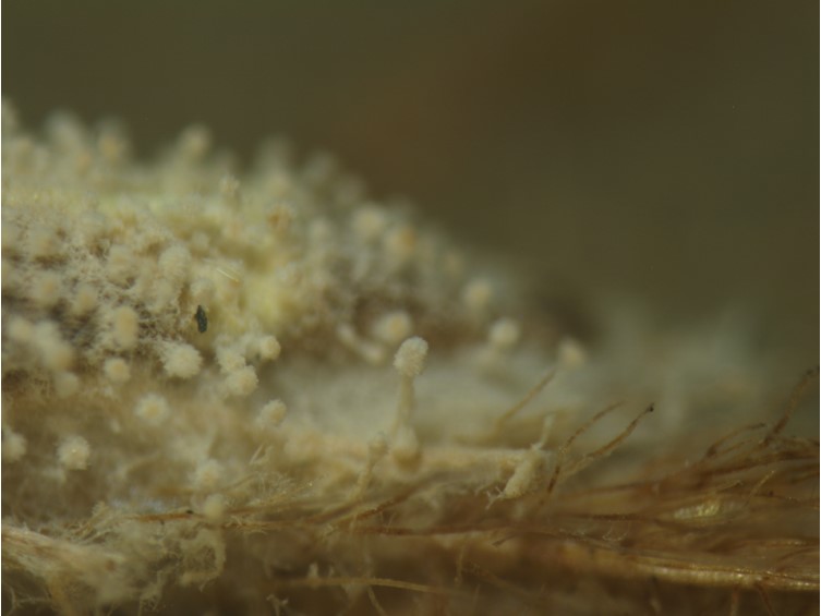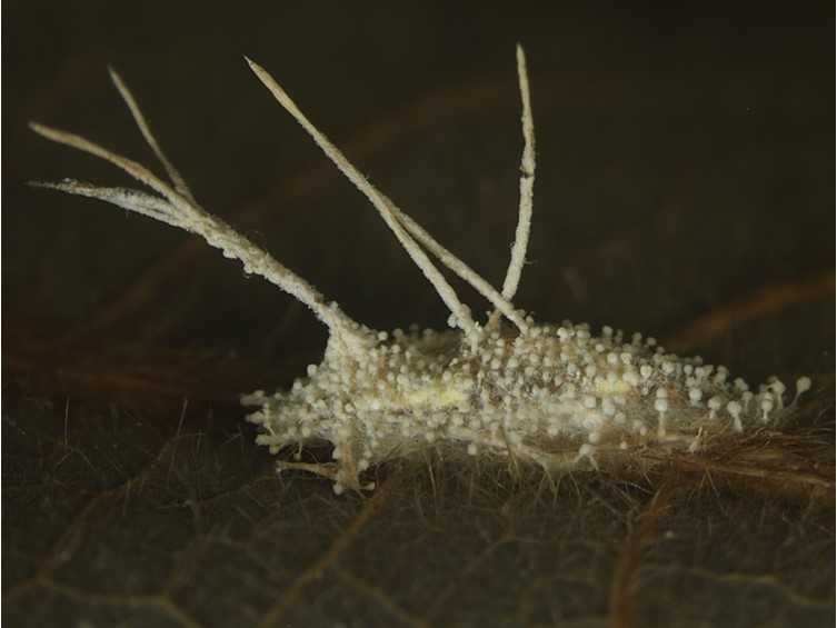 Conidia smooth-walled, hyaline, single-celled, fusoid, 2-3.2 × 0.8-2 μm. Several short synnemata arose on moth body, wings, and legs, white to cream, 197-300 × 15-40 μm, with diam of the tip 43-75 μm, cylindrical with subglobose or oblong end. Conidiogenous cells produced at the end of synnemata, monophialidic or polyphialidic. Phialides 5-10 × 1.8-3 μm, cylindrical to ellipsoidal with papillate end. Conidia smooth-walled, hyaline, single-celled, fusoid, 1-3 × 1-2 μm. Phialides and conidia from both long and short synnemata were on the same size range.