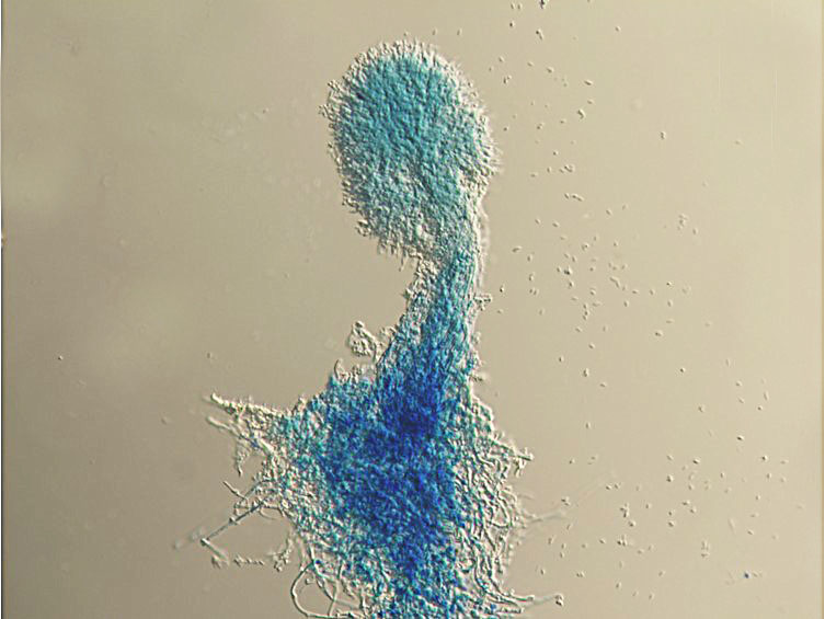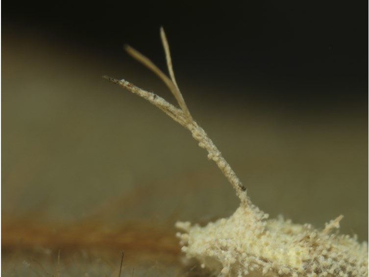 synnemata were produced on insect hosts. Several long synnemata arose at the head and in the middle of the host body, white to cream, up to 5 mm long and ca 120-150 μm wide, rarely branched, cylindrical to clavate with acute or blunt end. Conidiogenous cells produced along synnemata, monophialidic or polyphialidic.