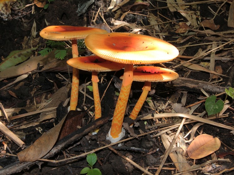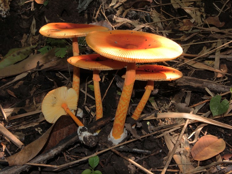 Fruit body medium to large. Pileus 70-100 mm in diam, ovoid, conical, convex to slightly plano convex with a central umbo at early stage, becoming plano-convex to applanate with a central depression at mature, orange-red, to red at center, becoming dark orange to strong orange yellow, unchanged after brushing, surface smooth, semi moist; margin striate, context thin toward margin, white in colour, turned yellow-brown, to yellow after exposed with air. Lamellae free, regular, yellowish, edge even, discolorus, orange-yellow to orange, lamellulae 1-2, truncated. Stipe 110-150 × 7-10 mm, central, more or less equal, sometimes broader toward base (8-15 mm broad), vivid orange yellow to pale orange yellow, surface cover with dense squamules, yellowish or yellow-orange in colour, moist to semi moist, context solid at young, white, turned yellowish after exposed with air. Annulus superior, skirt like, reddish orange, orange or reddish. Volva 30 × 15 mm, saccate, white to off white outer surface, cream to yellow-white inner surface. Odour unknown, Spore print not recorded.