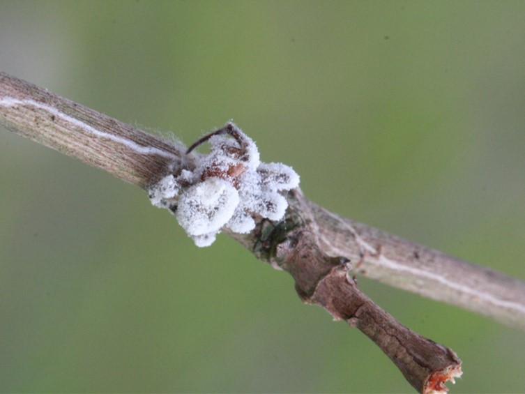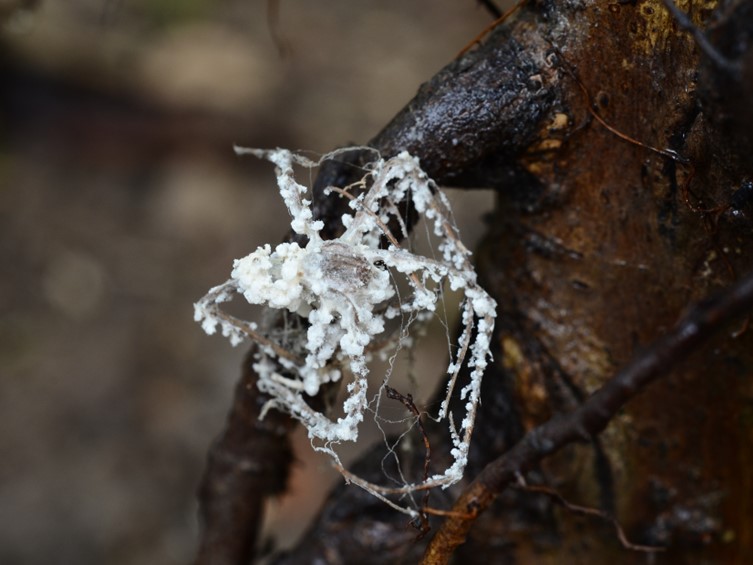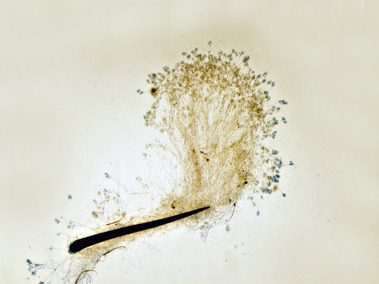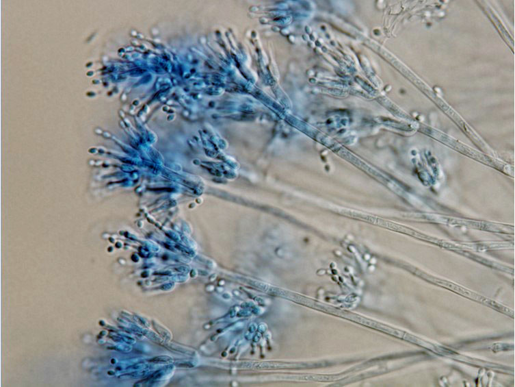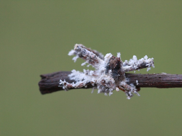 conidia. Conidiophores loosely grouped together, arising from different parts of the spider, usually biverticillate with
