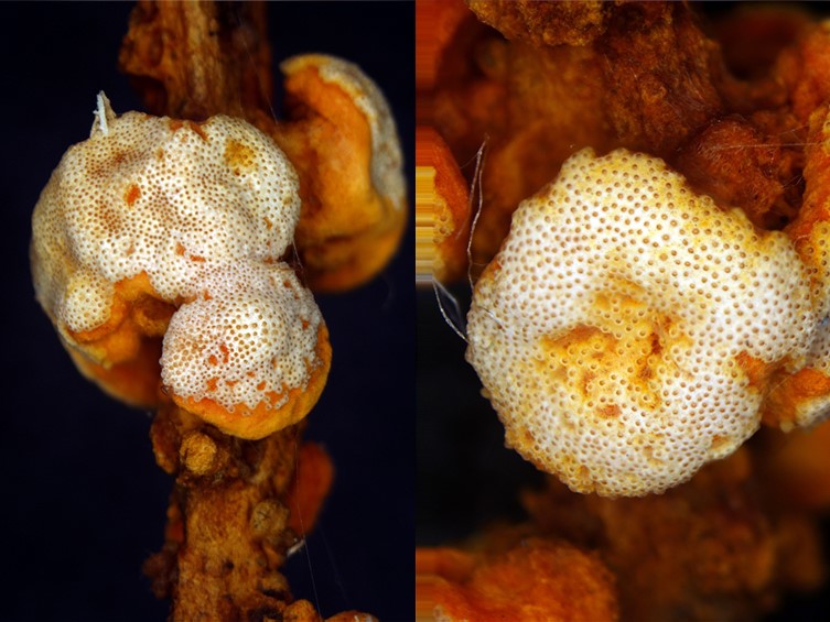Stromata epibiotic, pulvinate, subglobose, hemispherical, upper surface white to yellowish white; lower surface strong orange, 1-7 mm wide.