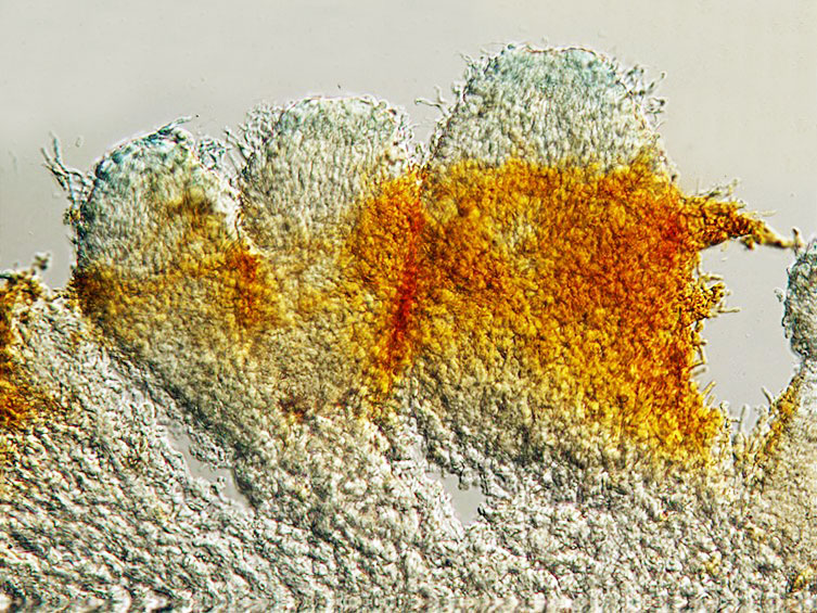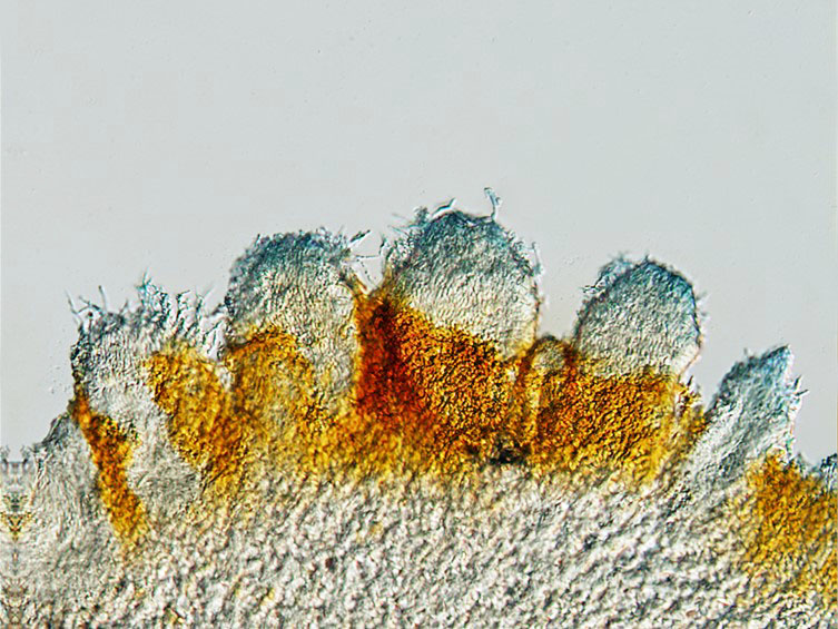 Stromata epibiotic, irregularly pulvinate or subglobose, upper surface very pale violet to light purplish gray, lower surface vivid yellow to strong orange, 3-7 mm wide.