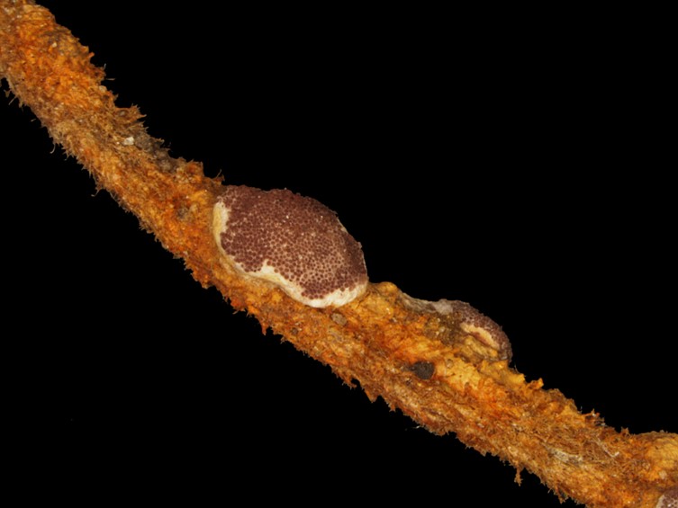 Stromata epibiotic, flattened to convex, cylindrical to irregularly shaped, upper surface very pale violet to dark purple, lower surface white to pale orange, 3-25 mm wide, 1-3 mm thick.