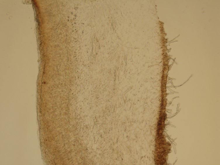 abhymenial hairs densely arranged, fasciculated at bottom, separated or clustered at the top, hyaline, blunt or pointed tip, thin or thick- walled, wall thickness 1-3.5 μm, clear lumen, hair bases 5.0 -7.5 μm wide, clamp connections present, zona pilosa 100-350 μm, zona compacta 25-35 μm, zona subcompacta superioris 40-50 μm, zona laxa superioris 140-200 μm, medulla 70-115 μm, zona laxa inferioris 100-320 μm, zona subcompacta inferioris 40-70 μm,