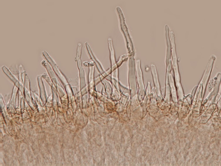abhymenial hairs densely arranged, hyaline, blunt or pointed tip, thick walled, wall thickness 2.0-2.5 μm, clear lumen, septa observed, hair bases 5-8 μm wide, clamp connections present, zona pilosa 25-30 μm, zona compacta 4.0-6.8 μm, zona subcompacta superioris 7-11 μm, zona laxa superioris 345-395 μm, medulla 180-290 μm, zona laxa inferioris 82-210 μm, zona subcompacta inferioris 75-90 μm,