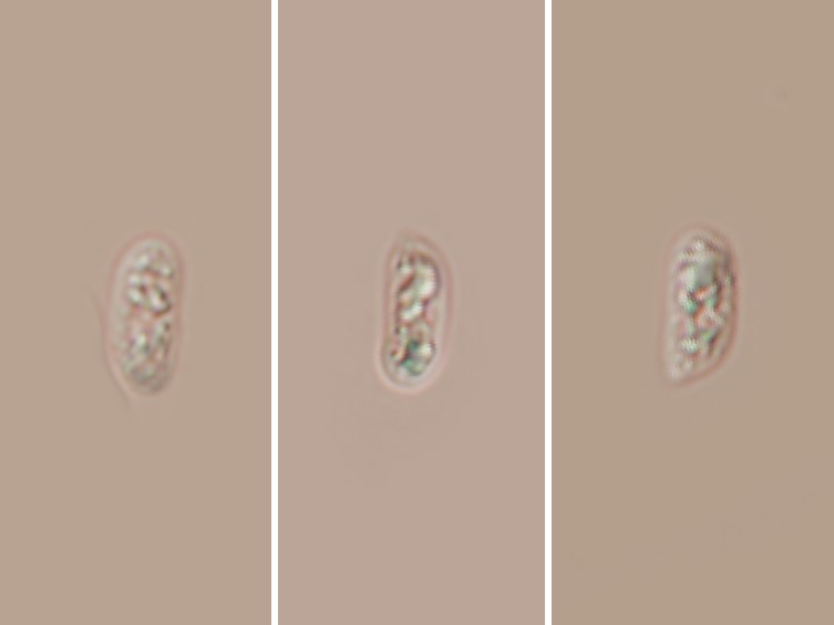 Basidiospores smooth walled, allantoid, hyaline, 5.0-6.5 × 5.0-5.5, with irregularly shaped guttules.