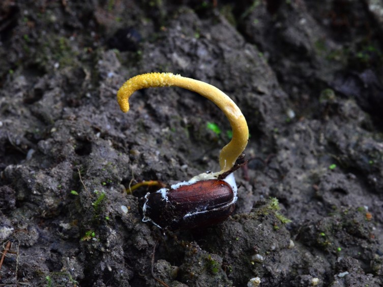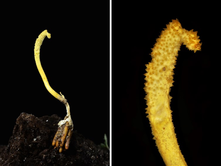 Stroma with slightly rhizoid mycelia covering and arising from the host, on the leaf litter, solitary, simple, slightly curved, cylindrical with rounded apices, 27 mm long, 1.5 mm wide. Stipe cylindrical, yellowish white to deep yellow. Fertile head on the upper part of stroma, cylindrical with rounded apices, yellowish white to butter yellow, 10 × 2 mm.