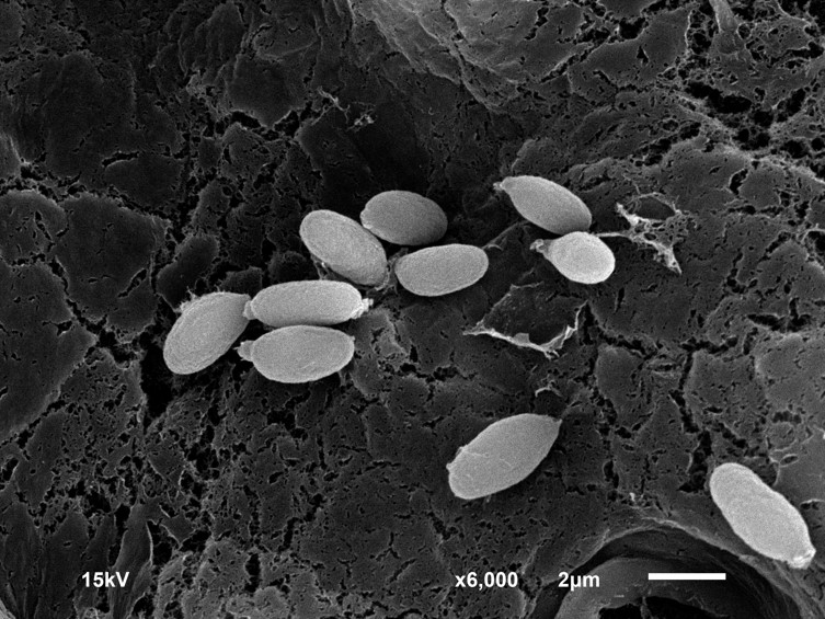 Perithecia semi-immersed and crowded at the apex of the stroma, ovoid, 300-630 × 130-378 μm.