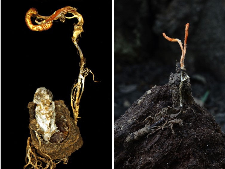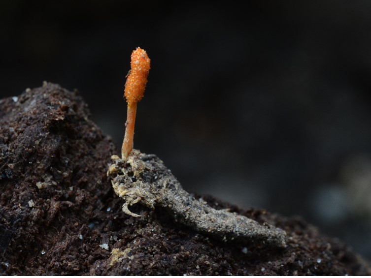 Stromata solitary or multiple, unbranched, 5-15 mm long and 1-1.5 mm broad, orange yellow, cylindrical to enlarging apically. Rhizoids flexuous, arising from the head region of host larvae buried 5-32 mm deep underground. Fertile part vivid reddish orange, cylindrical to clavate, elliptical, 2-6 mm long, 1.5-2.5 mm broad.