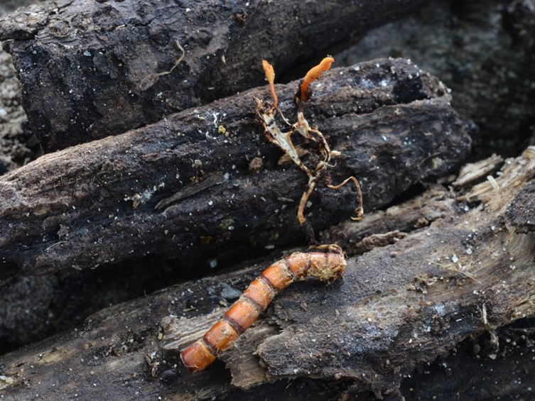 Stromata solitary or multiple, unbranched, 10-35 mm long and 1 mm broad, pale orange, cylindrical. Rhizoids flexuous, arising from the head region of coleopteran larvae buried in soil, 18-25 mm deep under the ground. Fertile part yellow orange, cylindrical to clavate, 2-5 mm long, 1-2 mm broad, occasionally lateral on stroma.