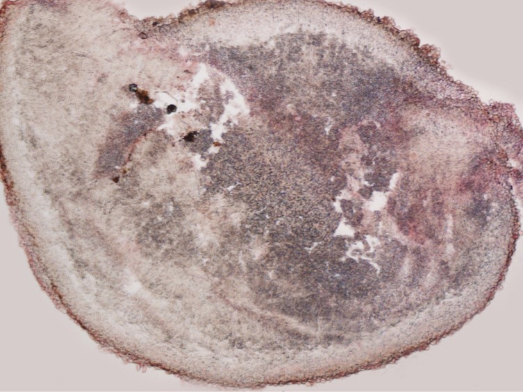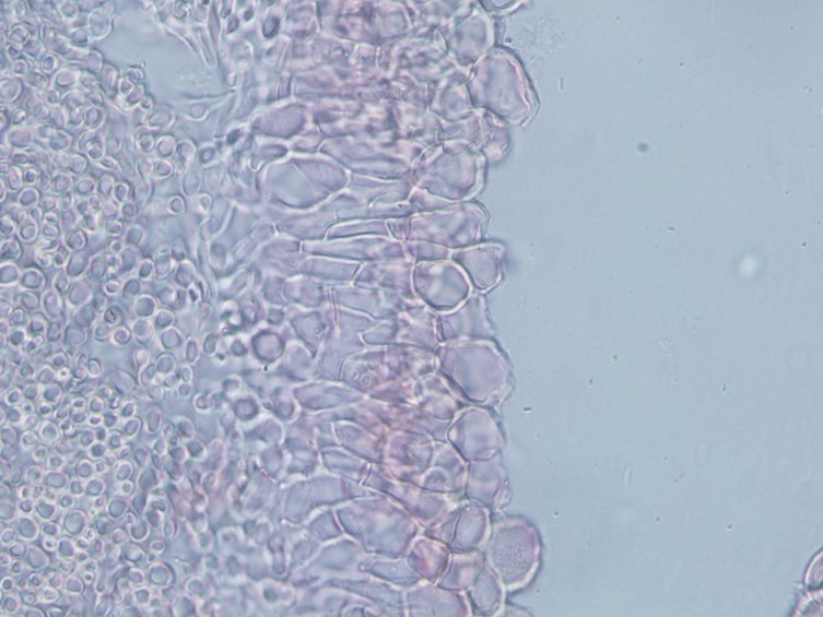 Excipulum 225 μm. Ectal excipulum composed of large, thin-walled, hyaline to pinkish cells of textura prismatica and medullary excipulum composed of hyaline to pinkish cells of textura intricata. Hymenium pinkish orange, fading to pale-yellow in dried specimens. Paraphyses 2.5 μm wide, numerous, filiform, septate, highly branched and slightly swollen at the apex forming the epithecium.