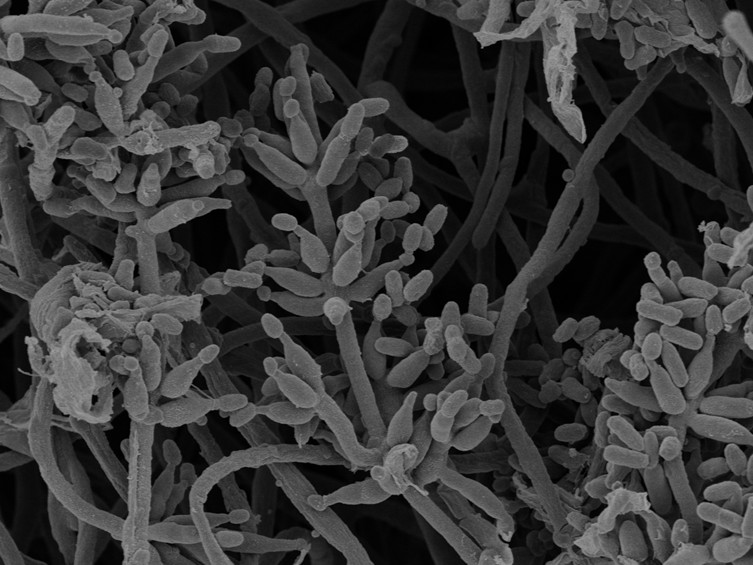 Phialides verticillate, in whorls of two–five, 4–8 × 2–3 μm, with globose to flask-shaped basal portion, distinct neck, 1–2 × 0.5–1 μm. Conidia in dry chains, white, mostly broadly ellipsoidal or slipper-shaped, aseptate, 2–5 × 1–2 μm.