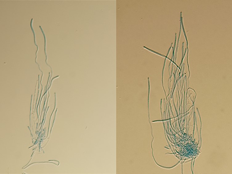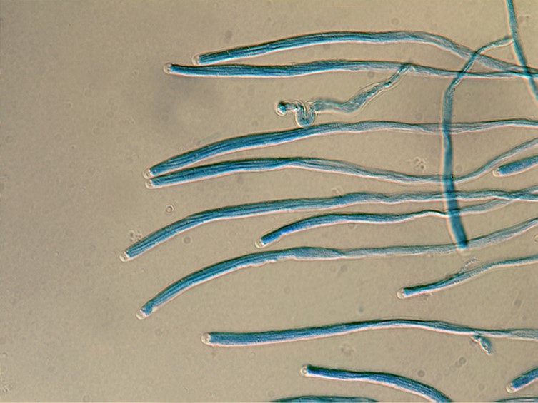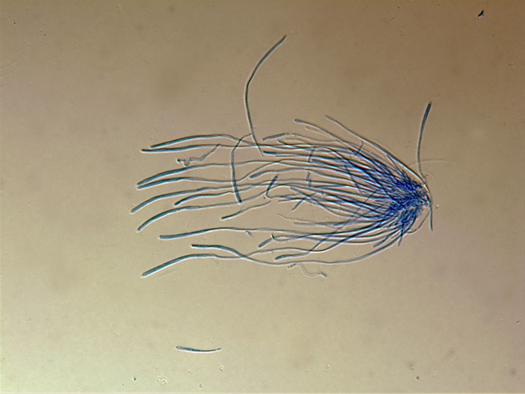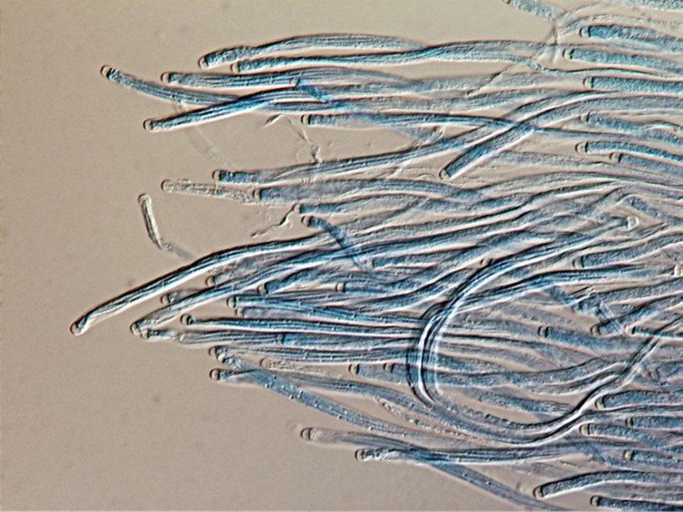 Asci cylindrical, 8-spored, 175-315 × 2-3 μm, bottom and apex thicker than the middle part. Ascospores smooth, whole, bola-shaped, 200- 300 μm in length, central part filiform, terminal parts narrowly fusiform, with four cells 25-30 × 1 μm, with three septa.