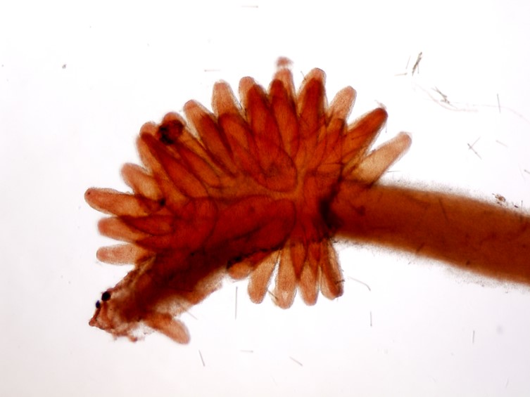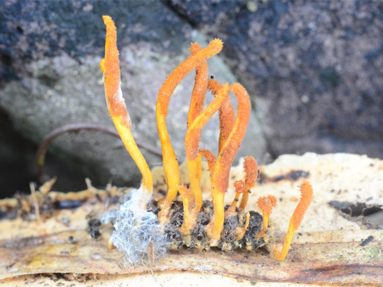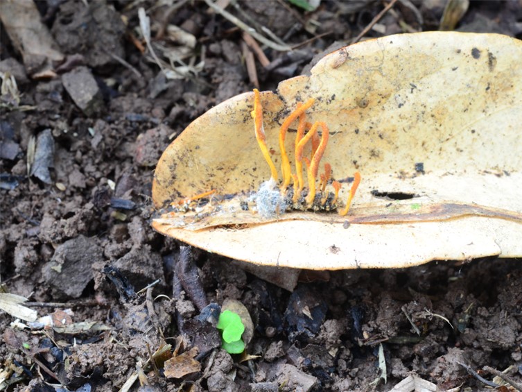 stromata arising from the thoracic and abdominal regions of the lepidopteran larva (body size 5-8 × 2-3 mm). Stromata cylindrical to clavate, up to 12 mm long and 1-1.5 mm broad. Upper part of the stroma fertile, orange, 4-7 × 1.5-2 mm.