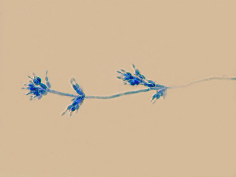 Colonies on PDA moderately fast-growing, ca 3 cm diam in 14 d at 25 °C, at first white with basal felt, becoming pale yellow with grayish violet in the center of colony, cottony with high mycelial density, reverse unpigmented. Prostrate hyphae smooth, septate, hyaline, 2–2.5 μm diam. Conidial structures consisting of erect conidiophores arising from either the aerial or prostrate hyphae, verticillate with phialides in whorls of two to five. Phialides 6–10 × 2–2.5 μm, with a cylindrical basal portion, tapering into a thin neck, 1–4 × 0.5 μm. Conidia in chains, hyaline, fusiform, 1-celled, 3.5–5 × 2–2.5 μm. Chlamydospores and synnemata not observed.