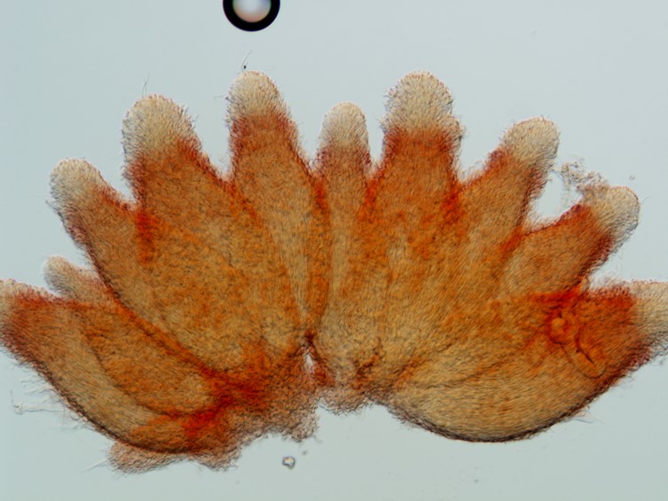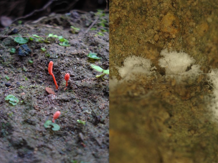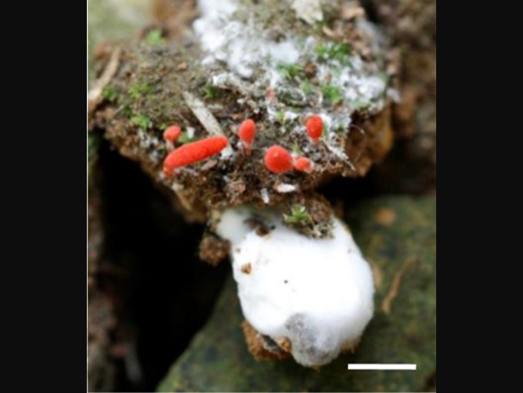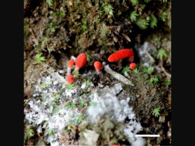 Stroma solitary, up to 8 mm long and 1-1.5 mm in width, cylindrical, pale red-orange. Rhizoids flexuous, arising from the body of spiders (Araneidae), ca 2-5 mm long, buried under the ground. Fertile part at apex. Ascomata clavate to subglobose, red-orange, 1.5-5 mm long, 1-2.5 mm in width.