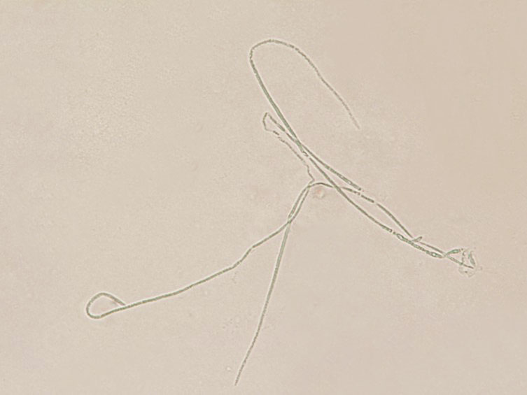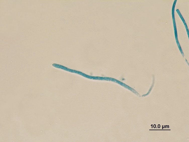 Asci cylindrical, up to 280 µm long, 3-5 µm in width. Ascospores hyaline, filiform with septations, up to 250 µm long, 1 µm in width. Asexual morph, evlachovaea-like, produced on base of the stroma and on the soil surface, powdery because of heavy sporulation, whitish, synnemata up to 1.5 mm long, conidiophores usually forming verticillate branches with phialides in whorls of 2-5. Entire phialides 5-10 × 2-3.5 μm, with swollen, ellipsoidal basal portion, tapering into a neck, 1-5 × 1 μm. Conidia hyaline, mostly ellipsoidal, fusiform, aseptate, 2-3.5 × 1-1.5 μm.