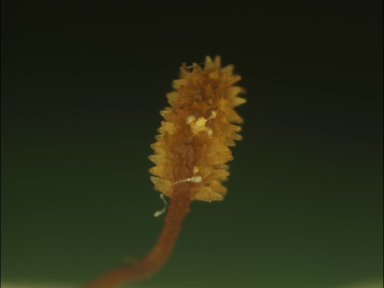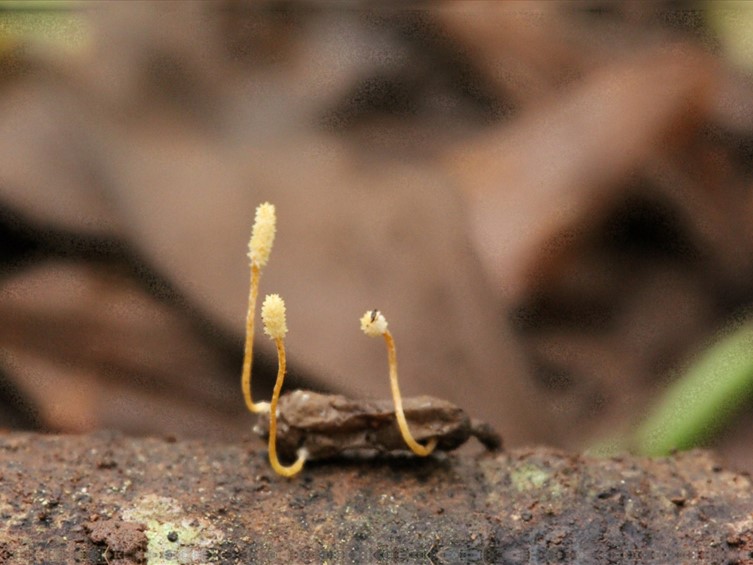 Stromata simple or compound, cylindrical, light orange, flexuose, arising from the sides of the ant pupae, 3-7 × 0.5-1 mm.