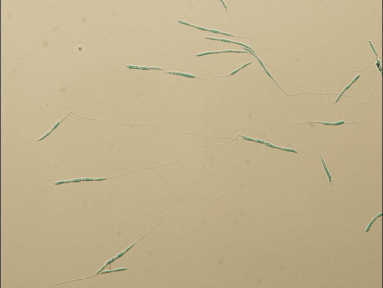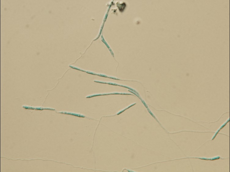 Conidia at first fusoid, then elongating and becoming cylindrical with age, hyaline, smooth-walled, 4–12 × 1–2 μm, ends rounded.