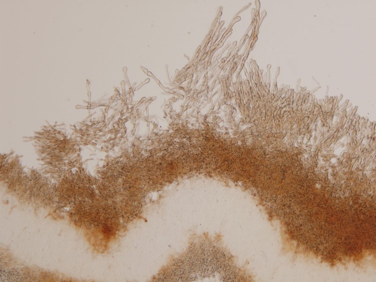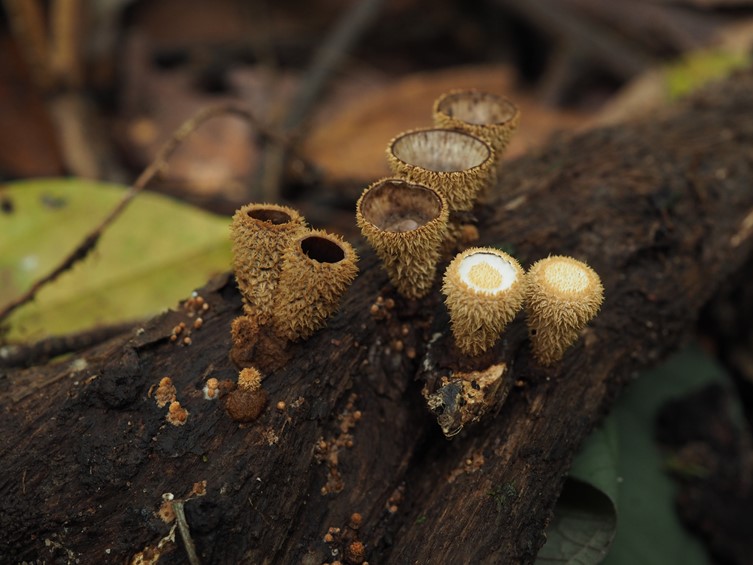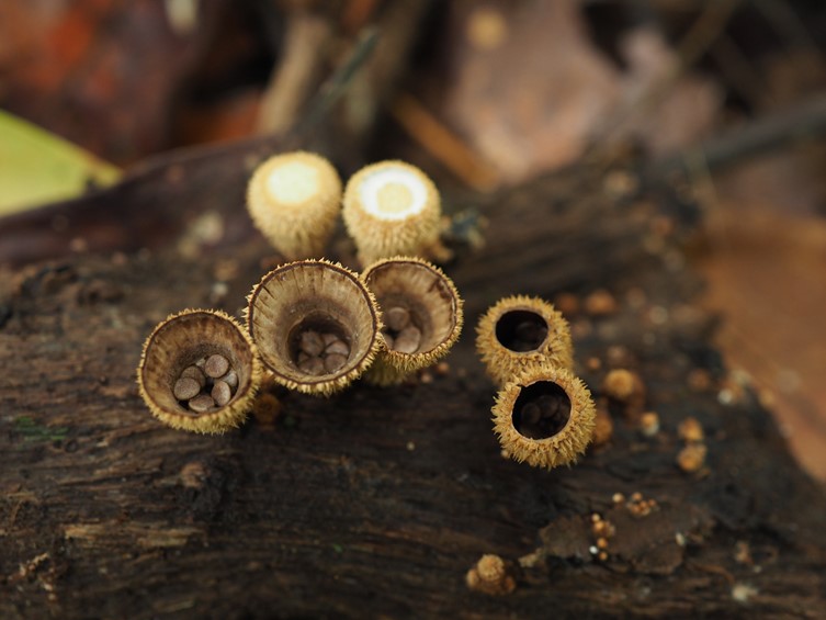 Fruiting bodies clavate when young, then opening, extending and becoming obconic to infundibuliform, with relatively straight sides in side view; 6–10 mm high, 4–8 mm wide at the top; external peridium covered by hairs aggregated into hirsute clusters, ivory, pale yellow or yellowish brown when young, then darkening to pale brown with age and the hairs turning pale. Inner peridium surface grey to brownish grey, darkening with age, obviously confuse when young, becoming striate to smooth with age. Epiphragm membranous white, covered by yellowish brown similar to those on the external surface of the peridium. Base of the fruiting bodies narrower than the rest of the fruiting body but lacking a distinct stipe. Peridioles 1.5–2 mm diam, lenticular, pale brown or greyish brown; peridiole covering composed of two layers: a black inner cortex layer, 13–24 µm thick, and a yellowish brown or dark brown outer tunica layer, 26–55 µm thick. Basidia not observed.