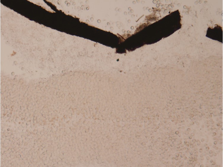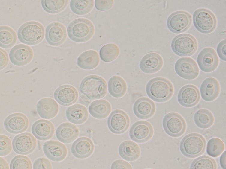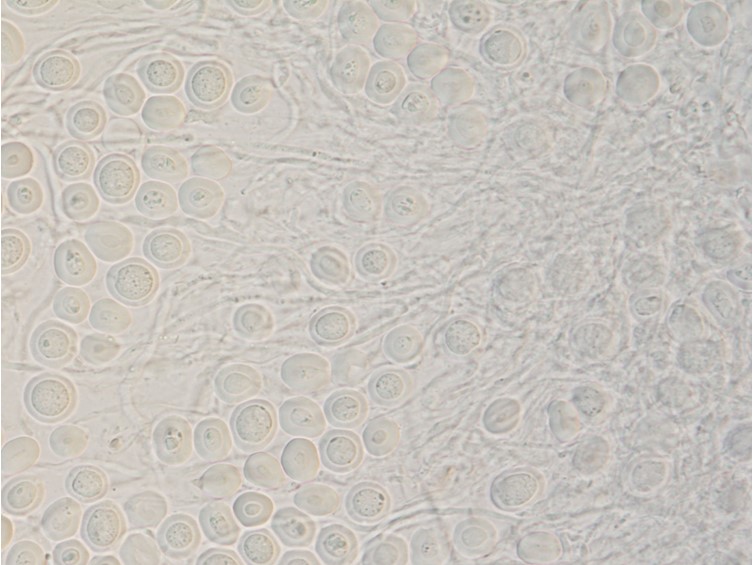 Basidiospores 12.5–15 × 12.5–13.75 µm, subglobose or rarely broadly ellipsoid, hyaline, smooth, thick-walled (1–2 μm). Clamp connections present.