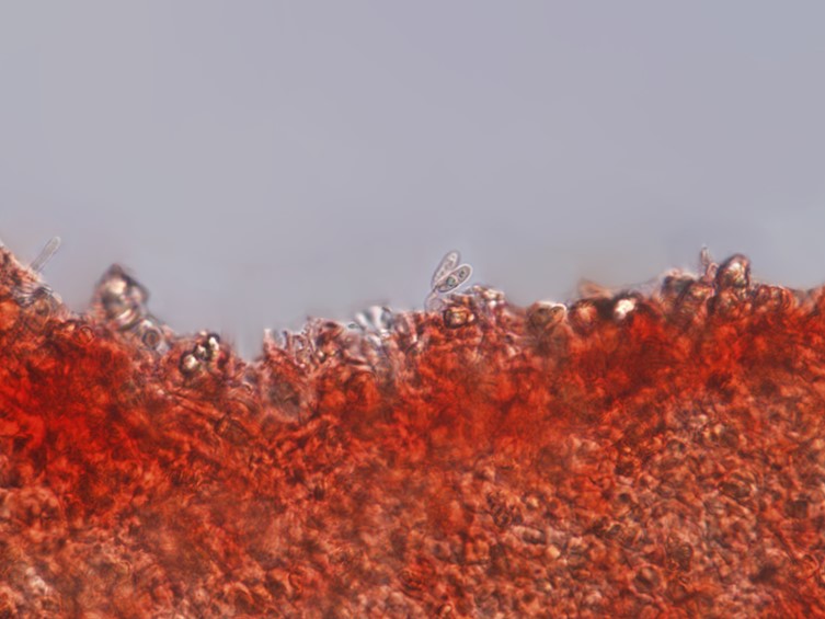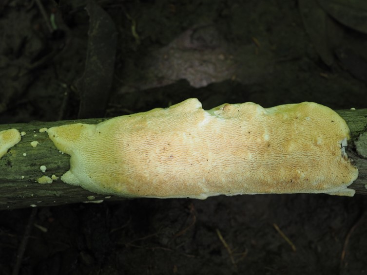 Basidiome resupinate, forming patches attached to woody substrates, light yellow pink to pale orange yellow in color. Individual patches measure 5–29 mm in width. The hymenophore is poroid, with 2–3 pores per mm. The specimen observed represents an immature fruiting body, without fully developed basidiocarps. Basidiospores 7.5–12.5 × 3–5.5 µm, oblong with parallel sides, hyaline, thin-walled. Basidia 9.5–19.5 × 2–5 µm, clavate, thin-walled, hyaline, 2–4 sterigmata, 0.5–3 µm long. Basidioles 14.5–20.5 × 3–7.5 µm, narrow at base with a swollen, rounded apex, hyaline, thin-walled. Three hyphal types are present: skeletal hyphae are thick-walled, hyaline, non-septate, 2–5 µm wide; binding hyphae are moderately thick-walled, branched, non-septate, hyaline, 2–6.25 µm wide; and generative hyphae are thin-walled, septate with clamp connections at the septa, 3–5 µm wide.