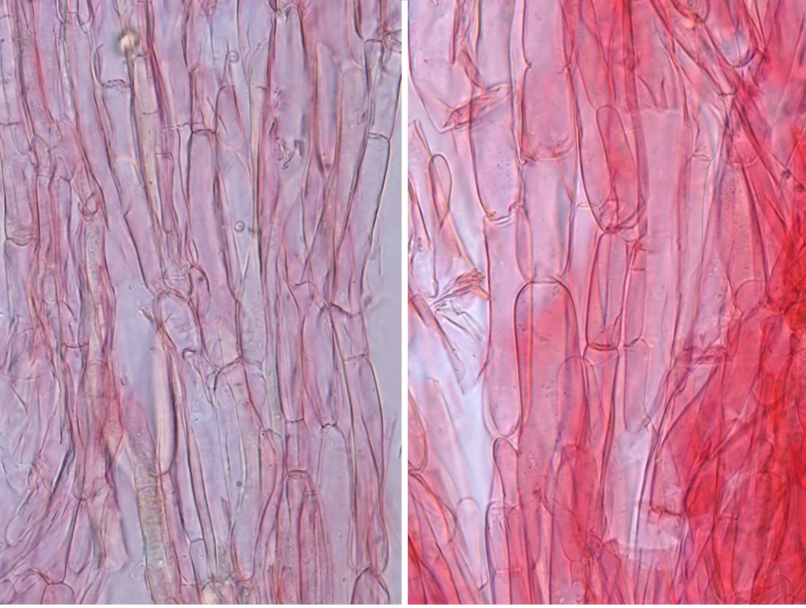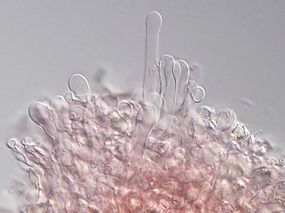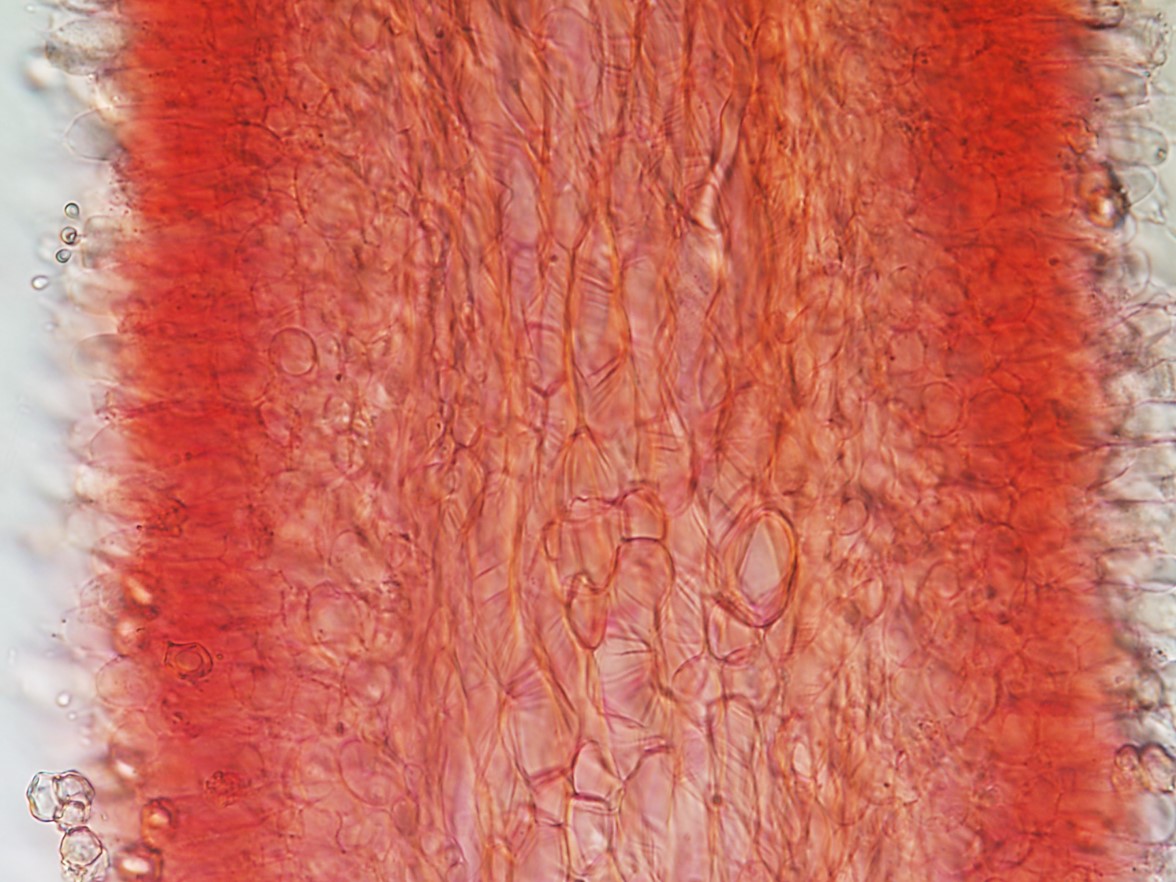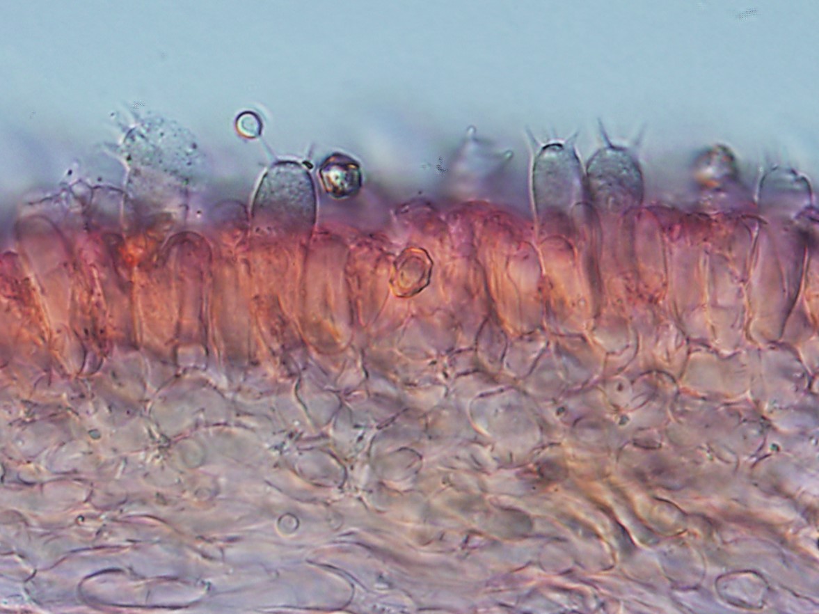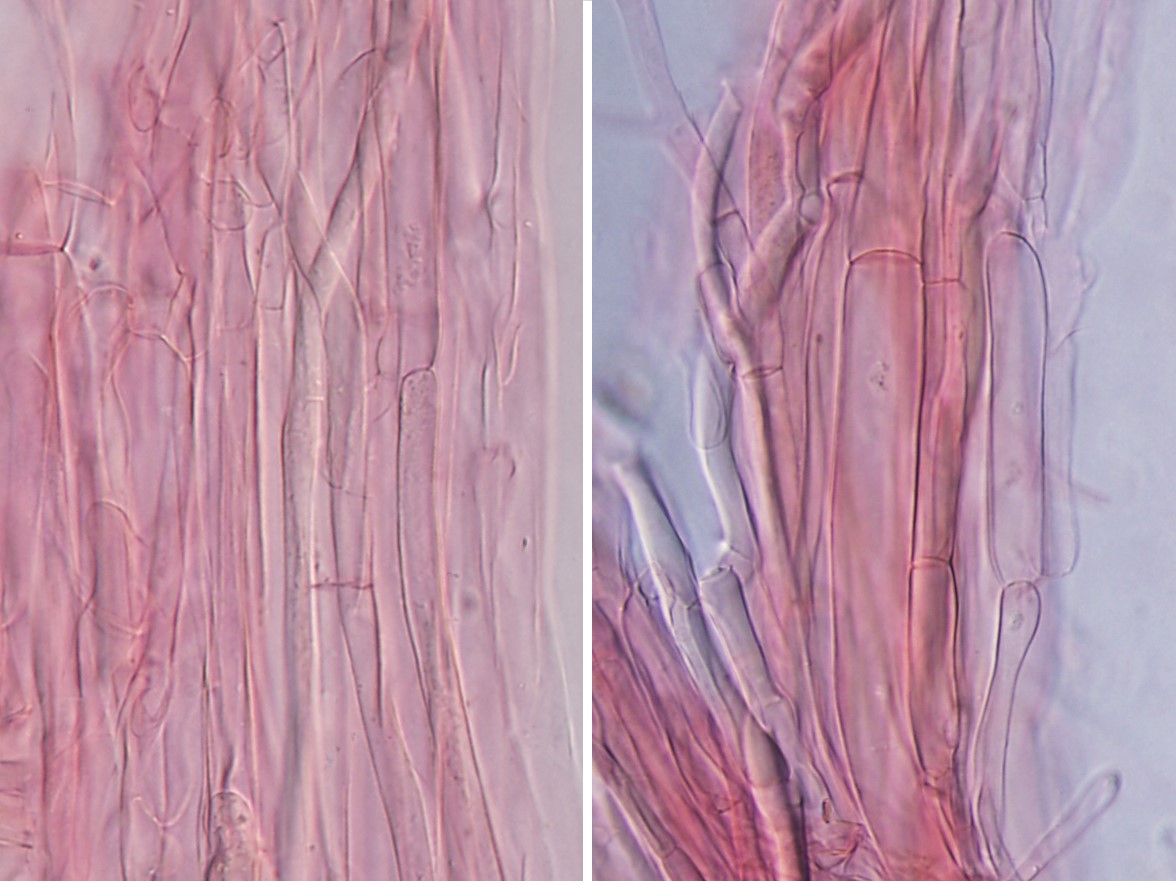 Basidia 4-sterigma, 27‒40.5 × 9‒10.5 μm, clavate, hyaline. Lamellae edge sterile, made up of a strand of cylindrical or slightly swollen towards the apex terminal elements of hyphae of the hymenophoral trama, colourless, 18‒59 × 4‒6 μm. Pileipellis a well-differentiated trichoderm of narrow erect cylindrical to subcapitate hyphae, 4‒8 μm diam, forming a loose palisade. Stipitipellis a loose layer of entangled cylindrical hyphae 4‒7 μm width. Clamp connections absent.