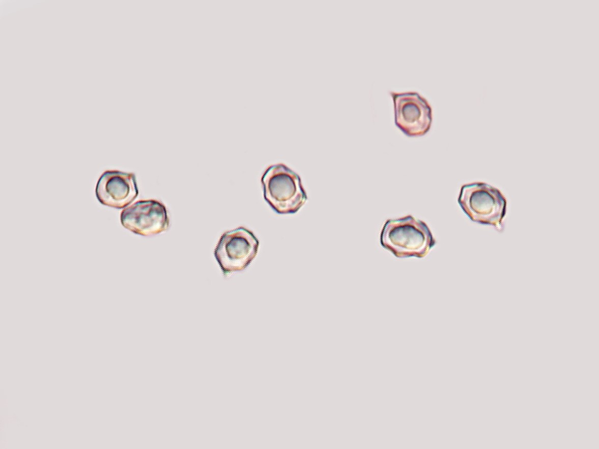 Basidiospores 8.5‒11 × 5.5‒7 μm, heterodiametrical, with 6–8 rather blunt to moderately pronounced angles in side view.