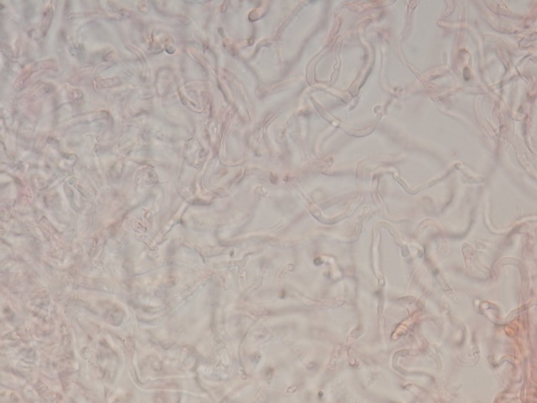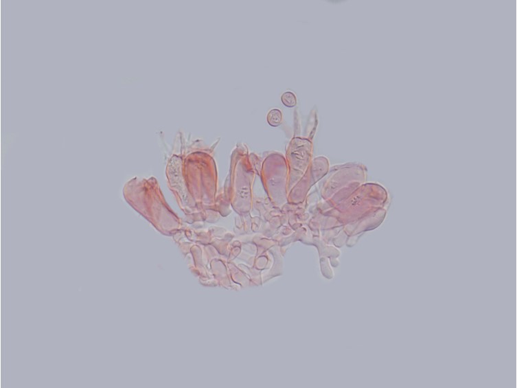 Basidia 25–38.75 × 8.75–12.5 µm, cylindro clavate, 4 spored, sterigmata 12.5 × 2 µm. Hymenophore edge fertile, cheliocystidia and pleurocystidia absent. Hymenophoral hyphae embedded in a thick gelatinous matrix, hyaline. Pileal trama composed of thin walled filamentous hyphae, 2–5 µm, embedded in thick gelatinous matrix, inamyloid. Clamp-connecions and oliferous hyphae present.