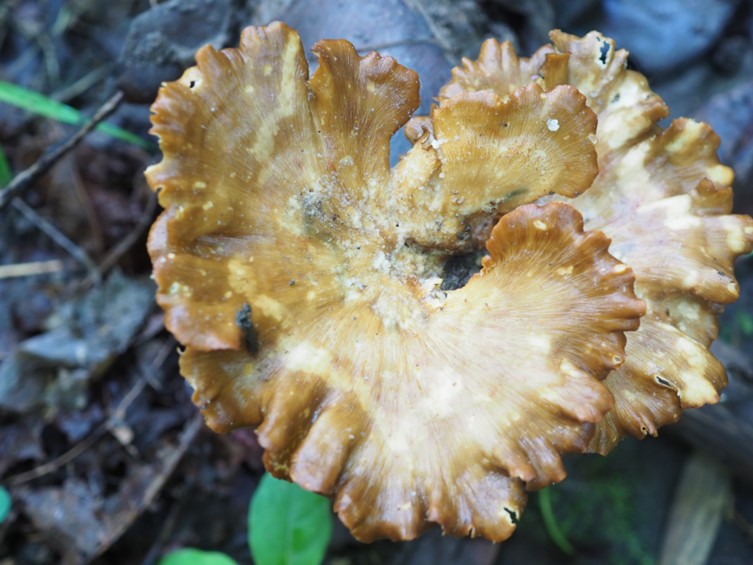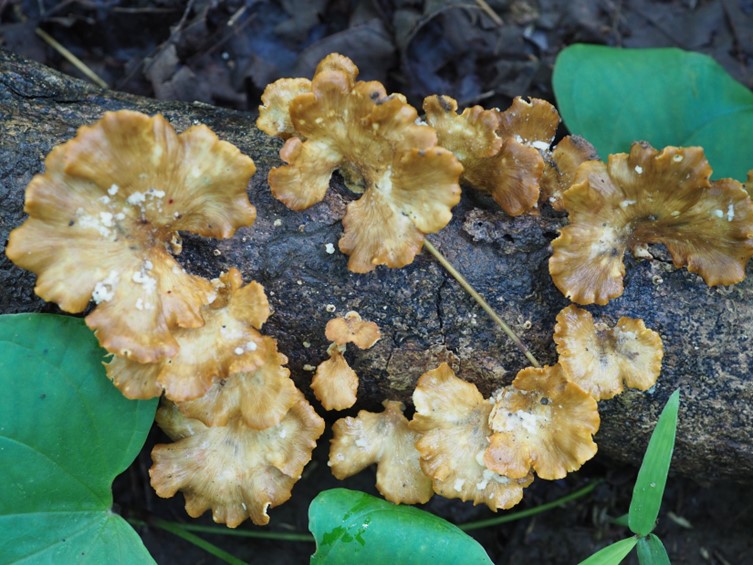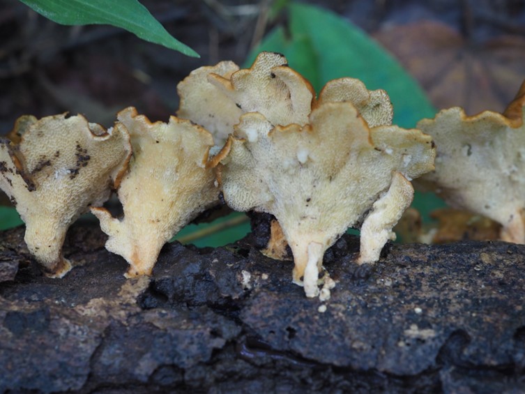 Basidiomata annual, laterally stipitate. Pileus flabelliform, attaining up to 68 mm in width and 4 mm in thickness; upper surface cream to tan or pale brown, radially fibrillose, often with darker squamules concentrated near the stipe base. Hymenophore poroid; pore surface straw-coloured to pale brown; pores 2.5–5 per mm, circular in youth, becoming elongated with age and frequently splitting; pores decurrent on the stipe. Context cream to ochraceous, firm, up to 4 mm thick. Stipe short, up to 10 mm long and 4 mm thick, concolorous with pileus, glabrous, generally affixed to substrate by a basal mycelial mat. Hyphal system dimitic. Generative hyphae hyaline, thin-walled, with scattered clamp connections, up to 4 µm wide, forming a cutis on both pilear and stipe surfaces. Skeleto-binding hyphae hyaline to yellowish, thick-walled, solid or with a distinct lumen, up to 10 µm broad, typically with straight walls. Basidia clavate, 4-sterigmate, 18–25 × 5–8 µm. Basidiospores oblong-ellipsoid to subellipsoid, 6–9 × 2.5–3 µm, hyaline, smooth, with notable size variation even within a single basidiocarp.