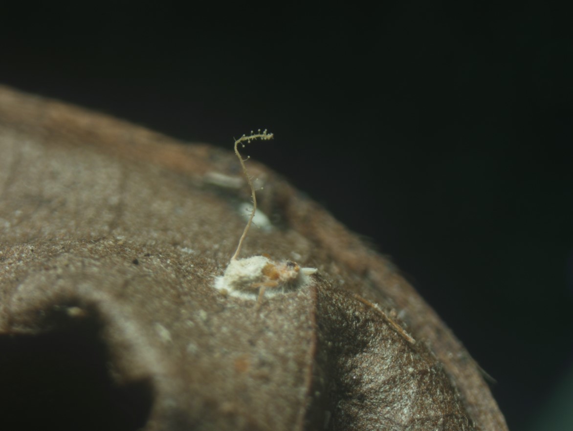 White mycelia growing over the spider, densely on the abdomen, occasionally on the cephalothorax and legs.