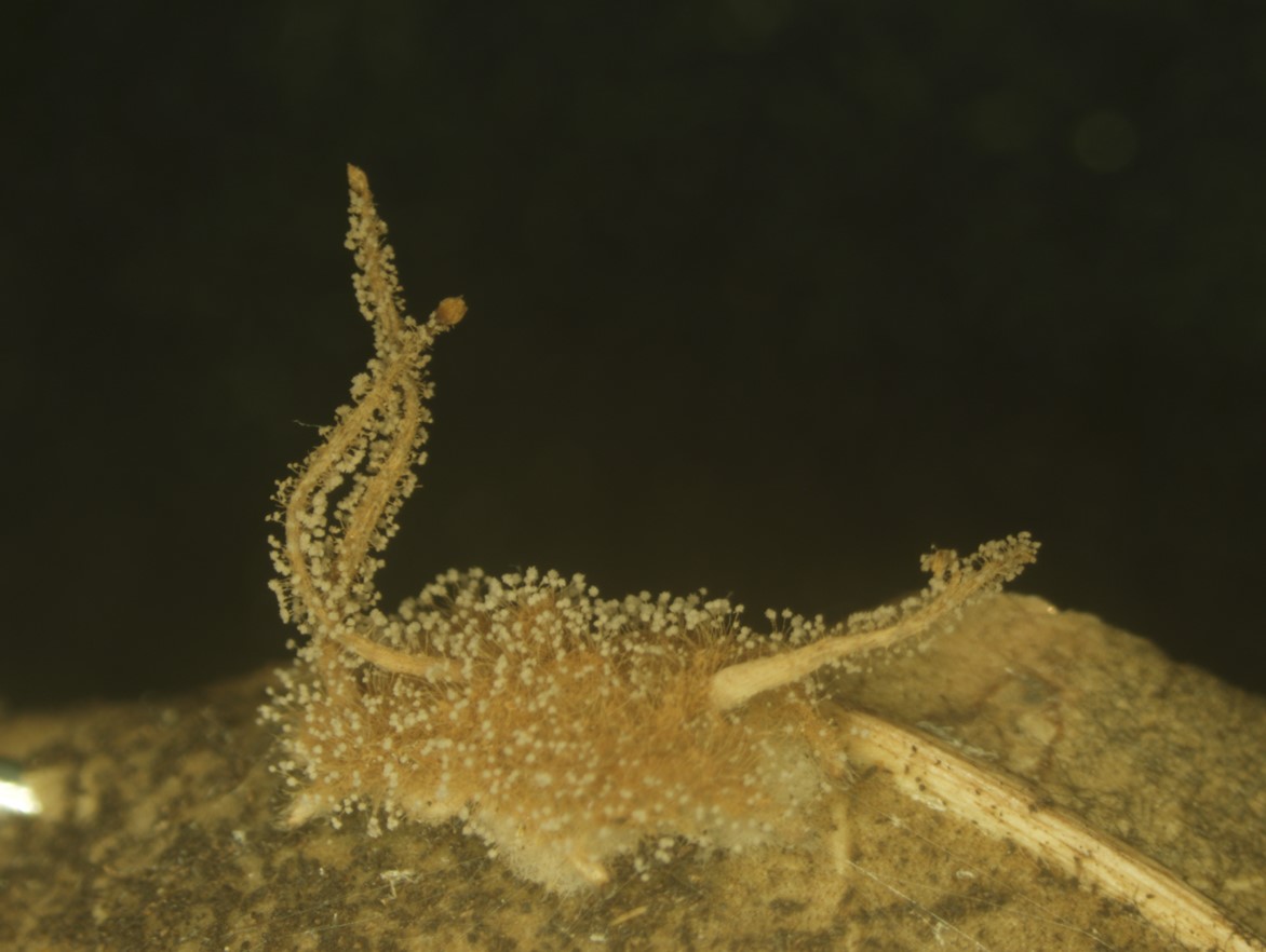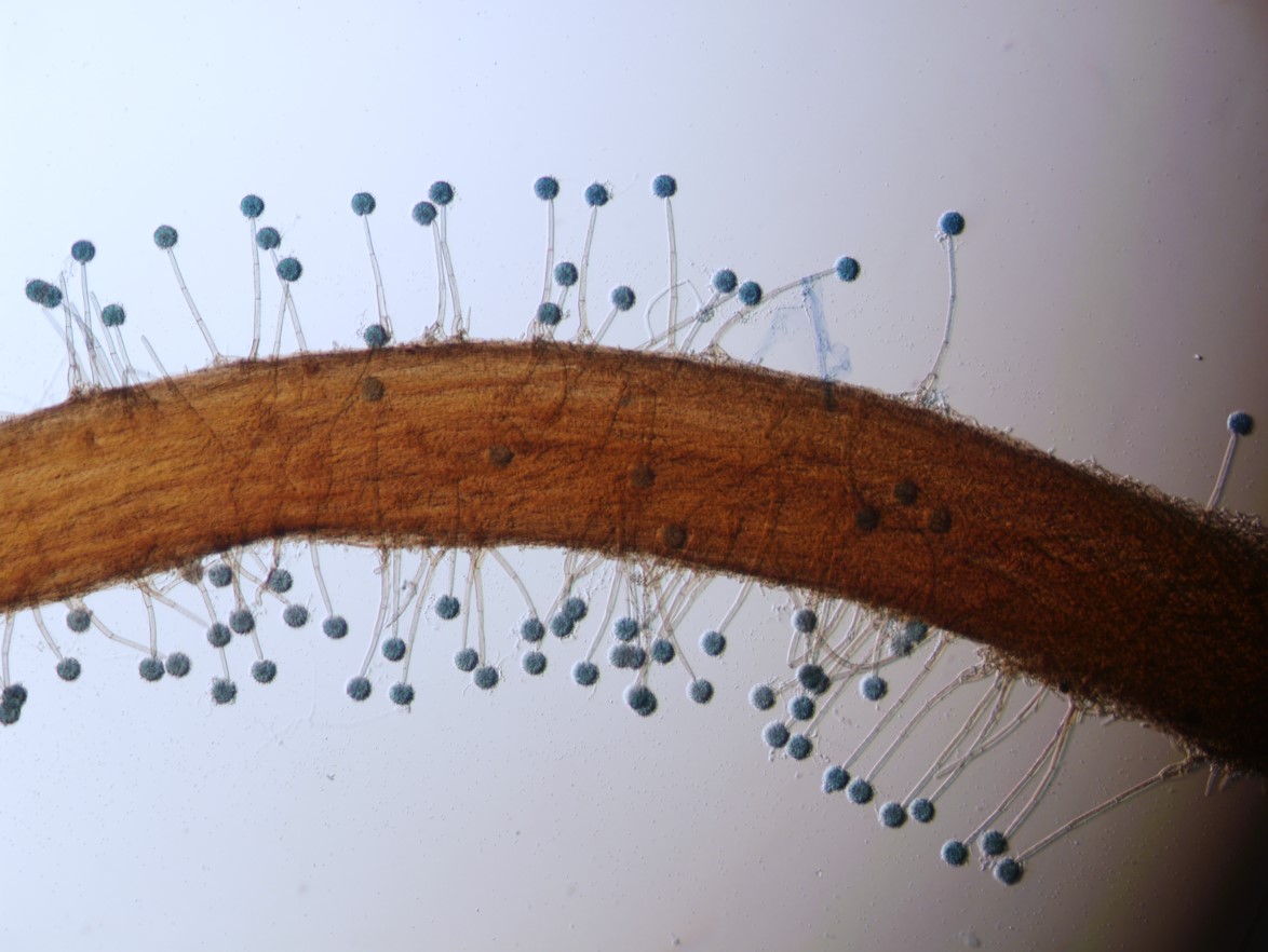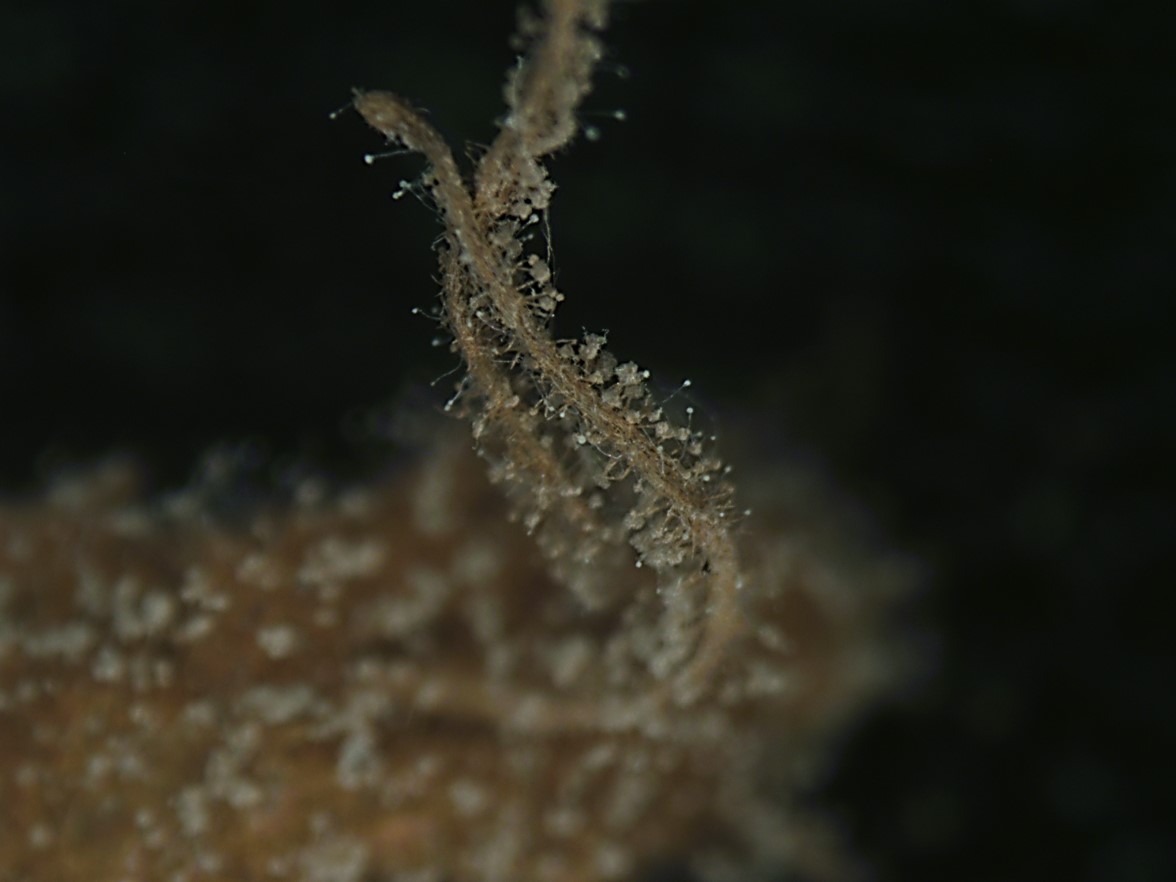 Synnemata pale brown, cylindrical, in pairs, 6 mm long, 475 µm wide, terminating in a swollen sterile globose tip, 600 µm wide.
