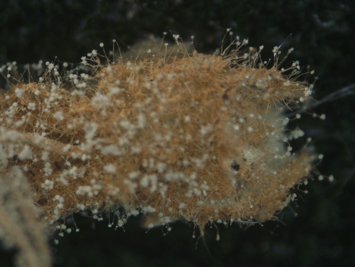 Spider completely covered by yellowish-light brown mycelial mat.