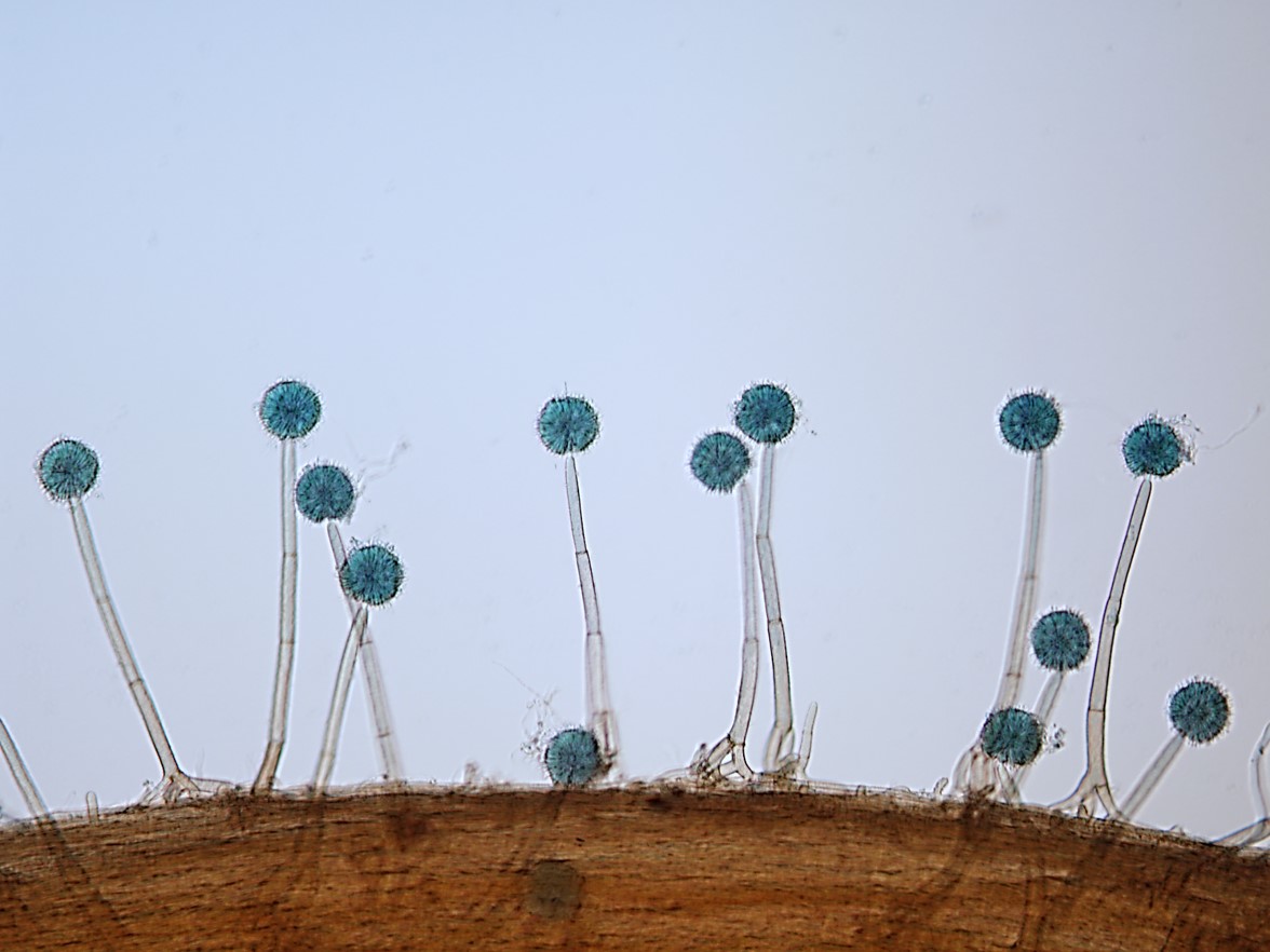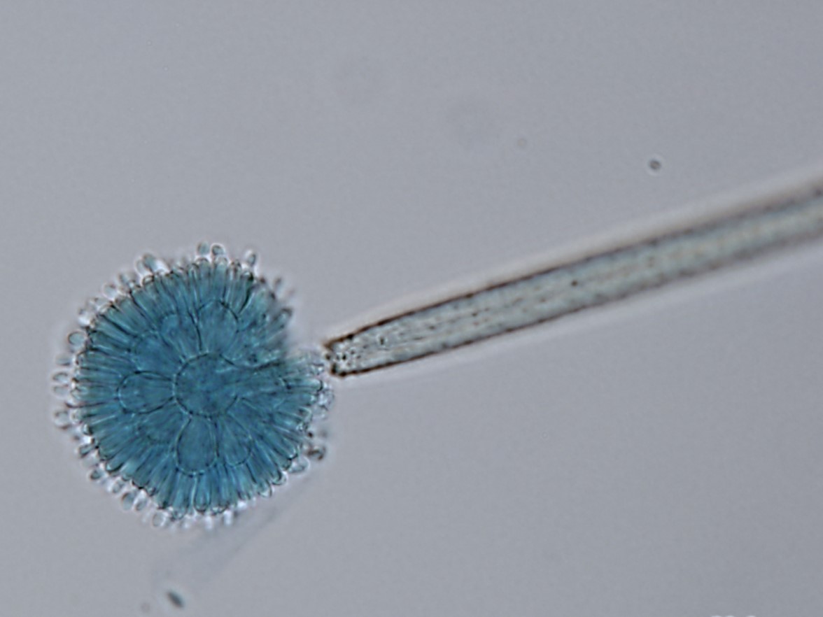 conidia. Conidia narrowly almond-shaped, 3–4 × 1.5–2 µm. Vesicle, metulae, phialides forming a spherical conidial head, 41–45 µm diam. Sexual morph and Granulomanus synasexual morph not observed.