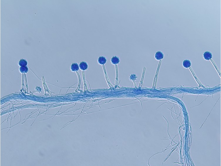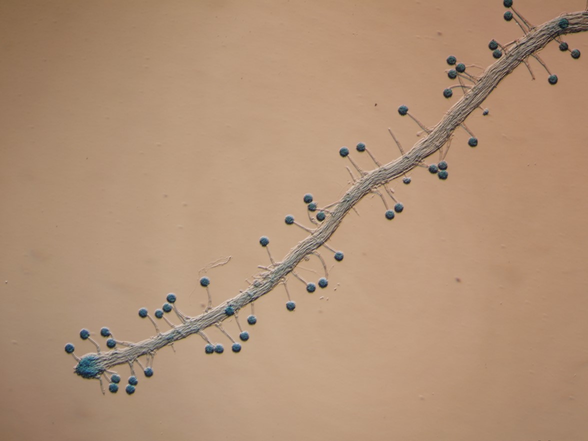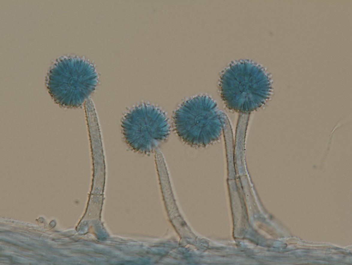Phialides borne on metulae, narrowly clavate to cylindrical, 6–7.5 × 2–2.5 µm, each bearing a conidium. A vesicle, metulae and phialides forming a spherical conidial head, 30–33 µm diam.