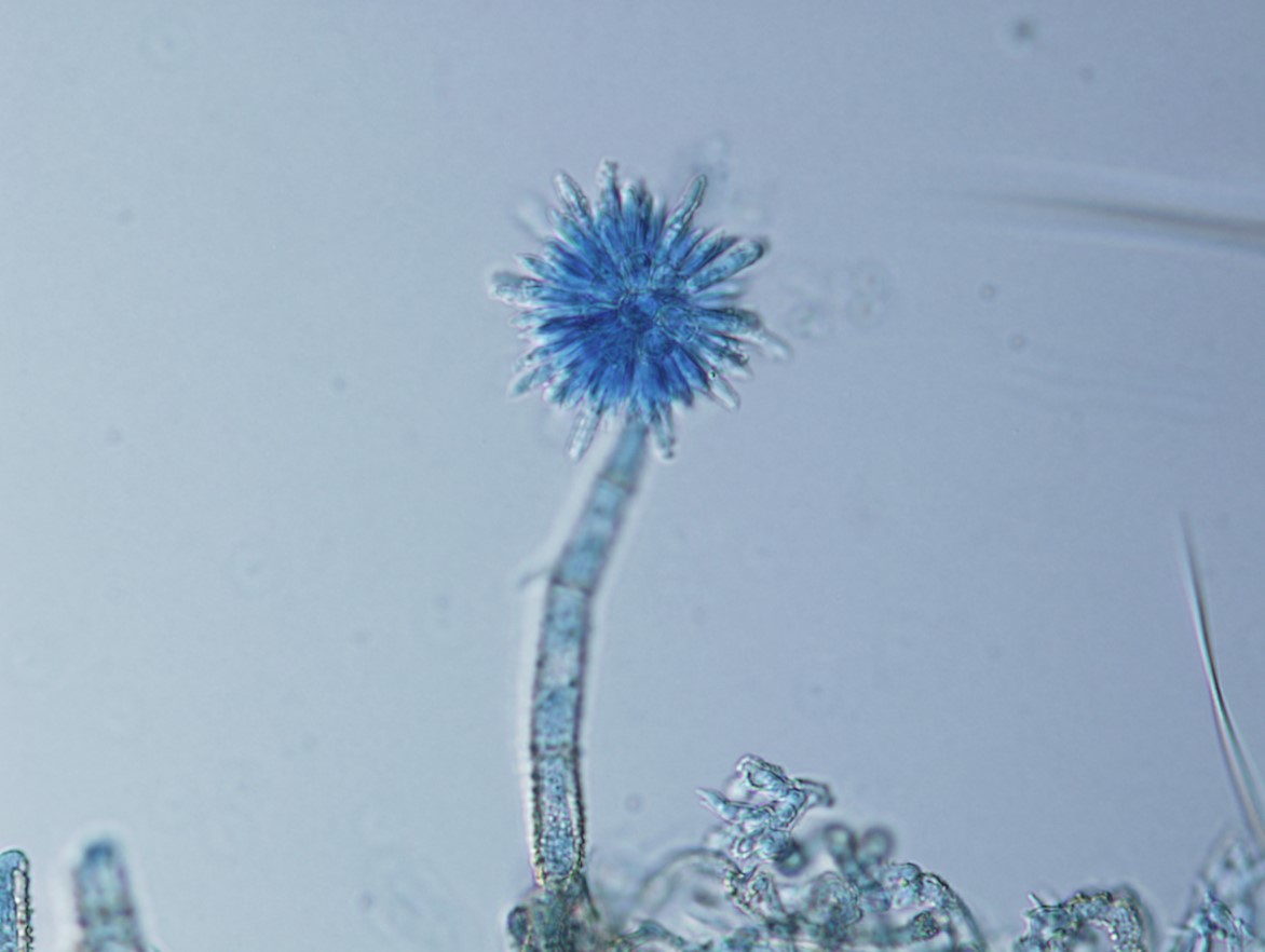 Conidial heads, 37–44 µm diam. Vesicle ellipsoidal, subglobose to globose, smooth, hyaline, 9–12 × 7–10 µm. Metulae broadly ellipsoidal, hyaline, smooth occasionally, 7–10 × 6–7 µm. Conidia fusiform, in short chains, 4–5 × 2 µm. Conidiophores of Granulomanus synasexual morph present, well-differentiated, roughened to distinctly verrucose, particularly around the base. Phialides holoblastic, cylindrical, clavate, flask-shaped, to irregularly shaped, mostly verrucose, rarely smooth, with one to three conspicuous denticles, 8–13 × 3 µm, bearing solitary, long, filiform conidia. Conidia smooth, hyaline, 10–19 × 1–1.5 µm. Sexual morph present.