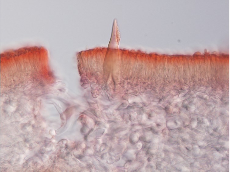 Pleurometuloids, fusoid to lanceolate, with the apical part covered partly with refractive encrusted crystals, thick-walled (5–7.5 µm thick), isolated, prominently projecting from the hymenium along both sides of the lamellar, 37.5–105 × 8.75–20.0 µm