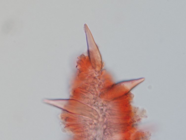 Cheilometuloids fusoid to lanceolate with the apical part covered partly with refractive encrusted crystals, thick-walled (3–3.75 µm thick), isolated or in groups at the lamellar edge, prominently projecting from the hymenium, 32.5–62.5 × 7.5–15.0 µm.