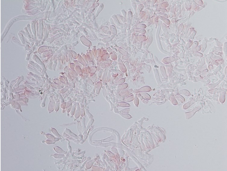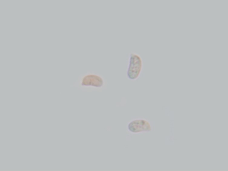 Basidiospores inamyloid, hyaline with dull granular content or with one or more oil drops, smooth- and thin-walled, allantoid, some reniform, 5–7.5(–7.8) × 2.5–3.5(–3.8) µm.