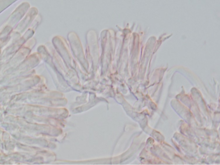 Basidia hyaline, thin-walled, clavate to subcylindrical, 15–20 × 3.5–5.0 µm, with 2-4 sterigmata of 2.5–5.0 µm long.