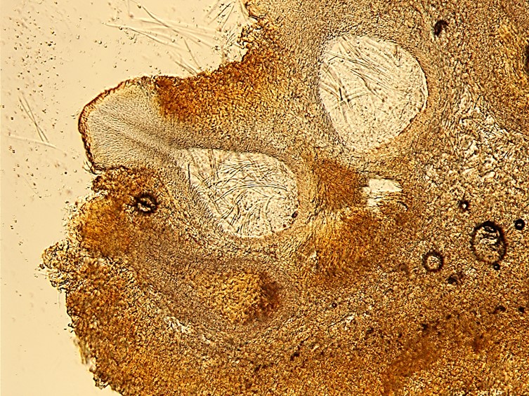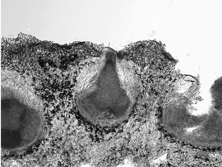 Perithecia crowded, immersed, 380-500 × 170-220 mm, elongate flask-shaped, ostioles slightly projecting, translucent dark red-brown.