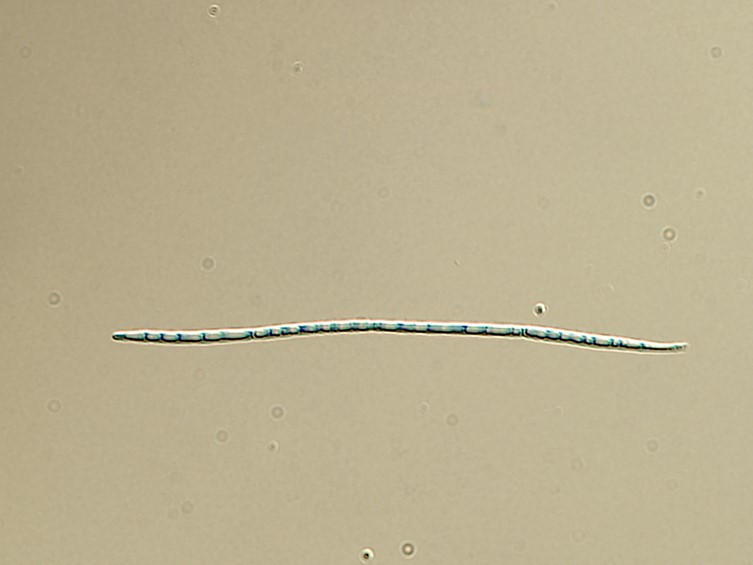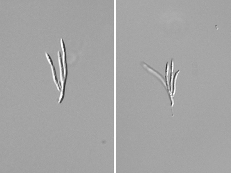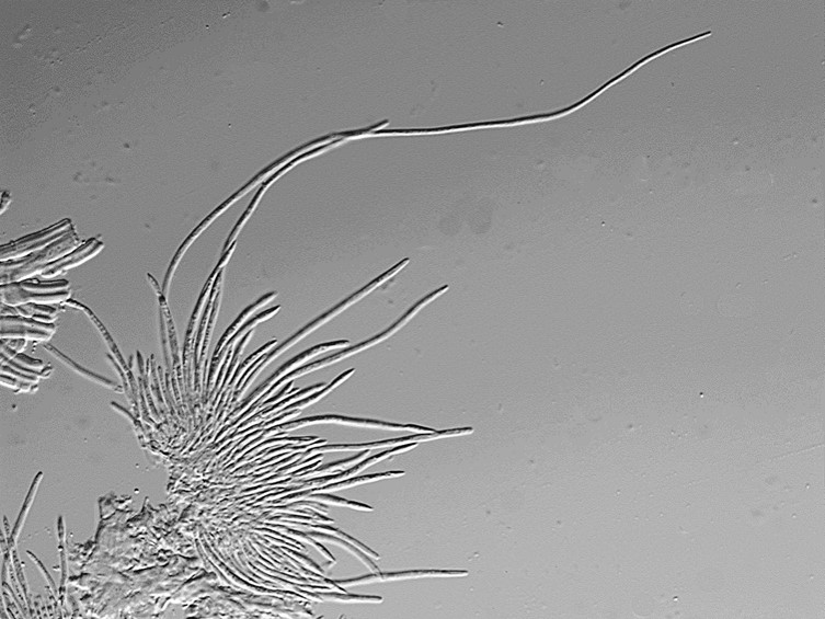 Ascospores whole, non-fragmenting, 130-150 × 1.5-2 mm, blunt at upper end tapering to the tail.